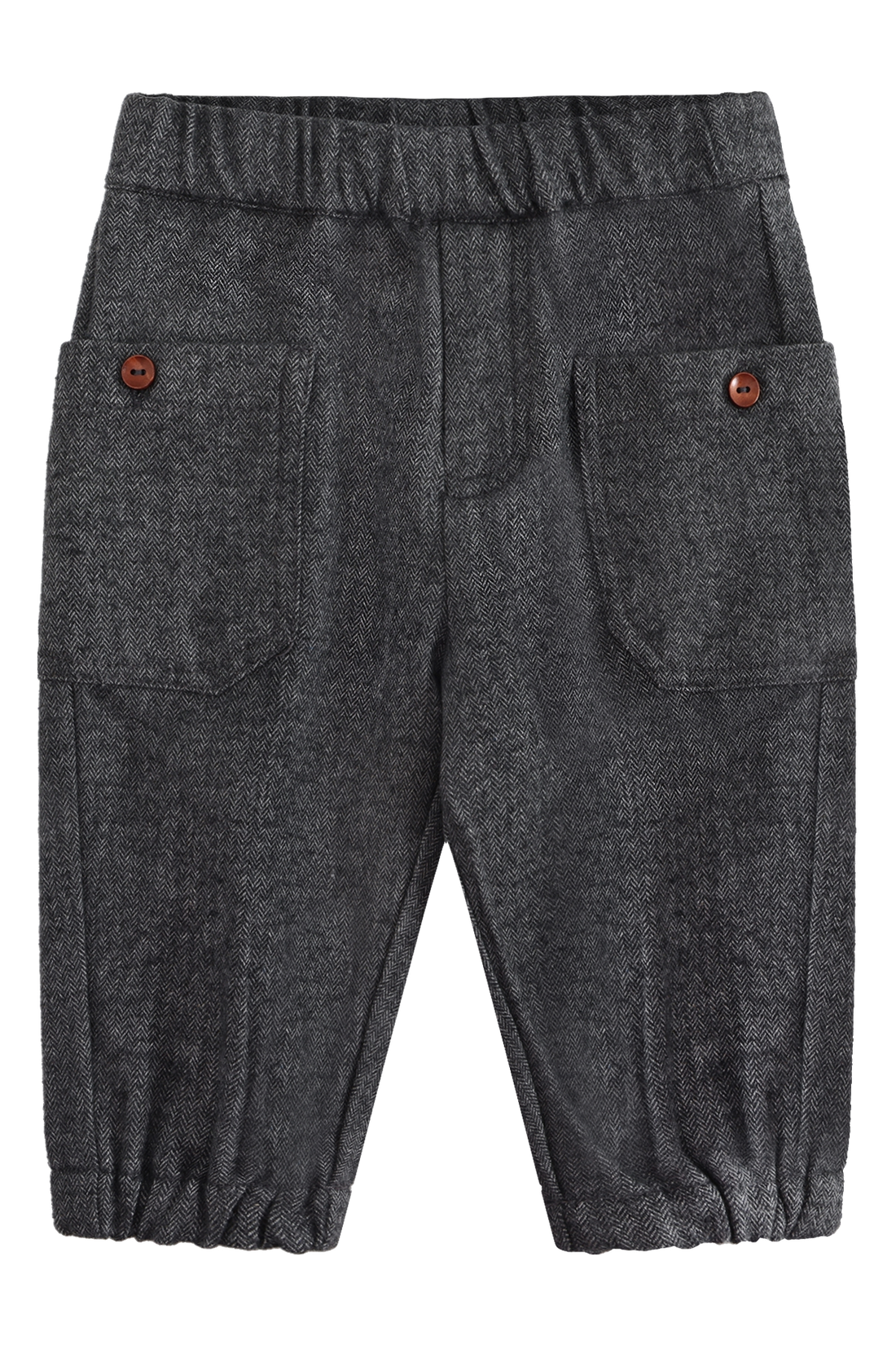 Vevd bukse med strikk og snøring i midjen. Modellen har lommer foran og brettede bukseben....