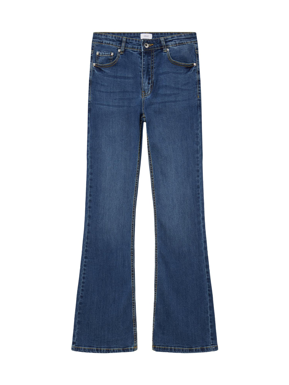 Texas slengbukser i mørkeblå vask, med fem lommer og glidelås-/knapplukking. Løse fra kne til ankel....