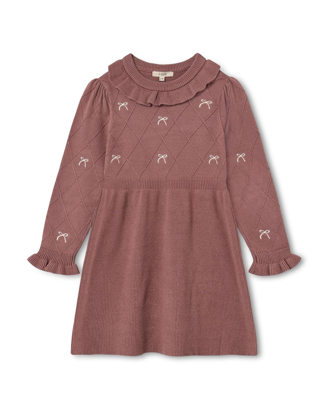 Finstrikket kjole i en støvete rosa fargetone, dekorert med små sløyfer og en feminin rysjekant...