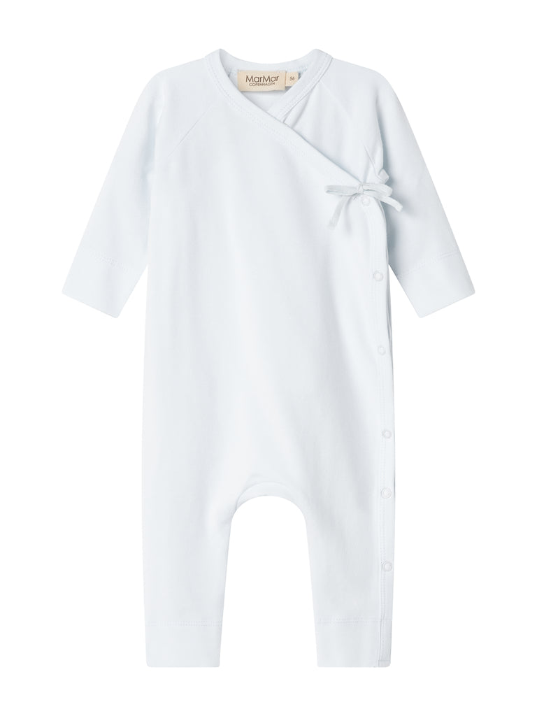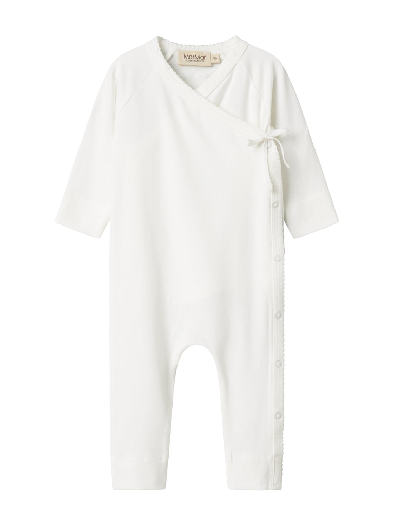 Langermet baby jumpsuit i pointelle med føtter. Jumpsuiten har en omslagslukking og lukkes med trykknapper...