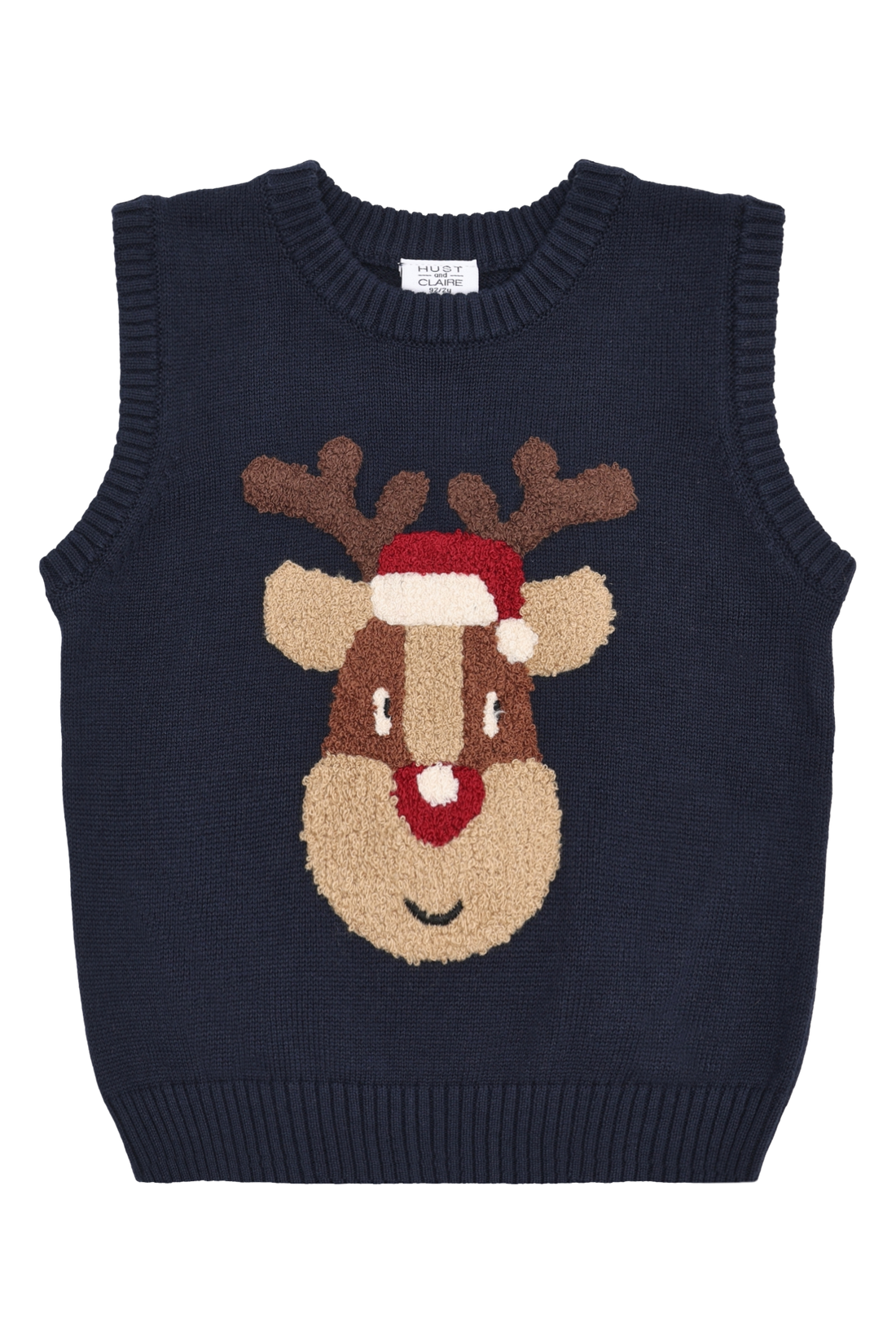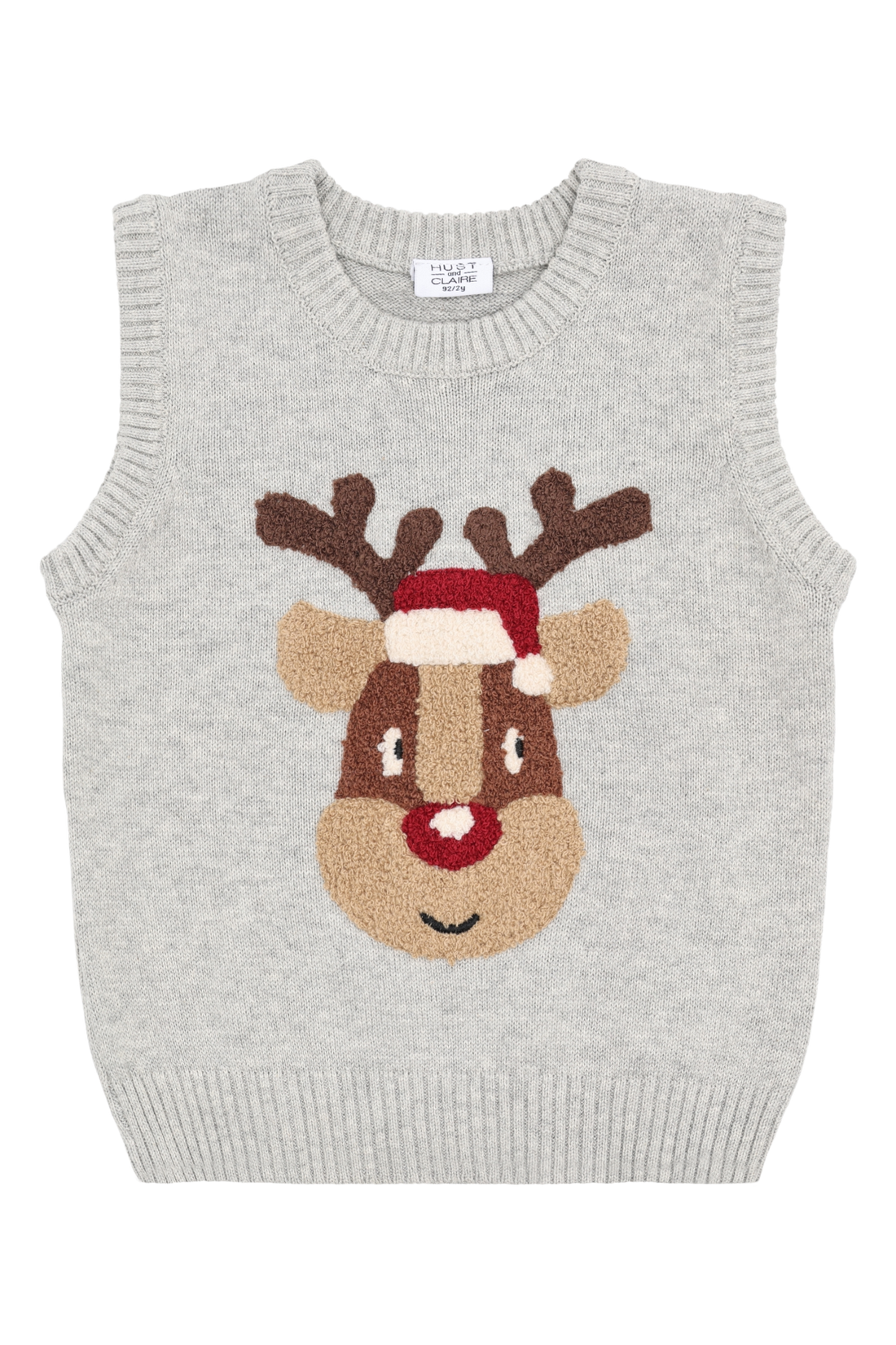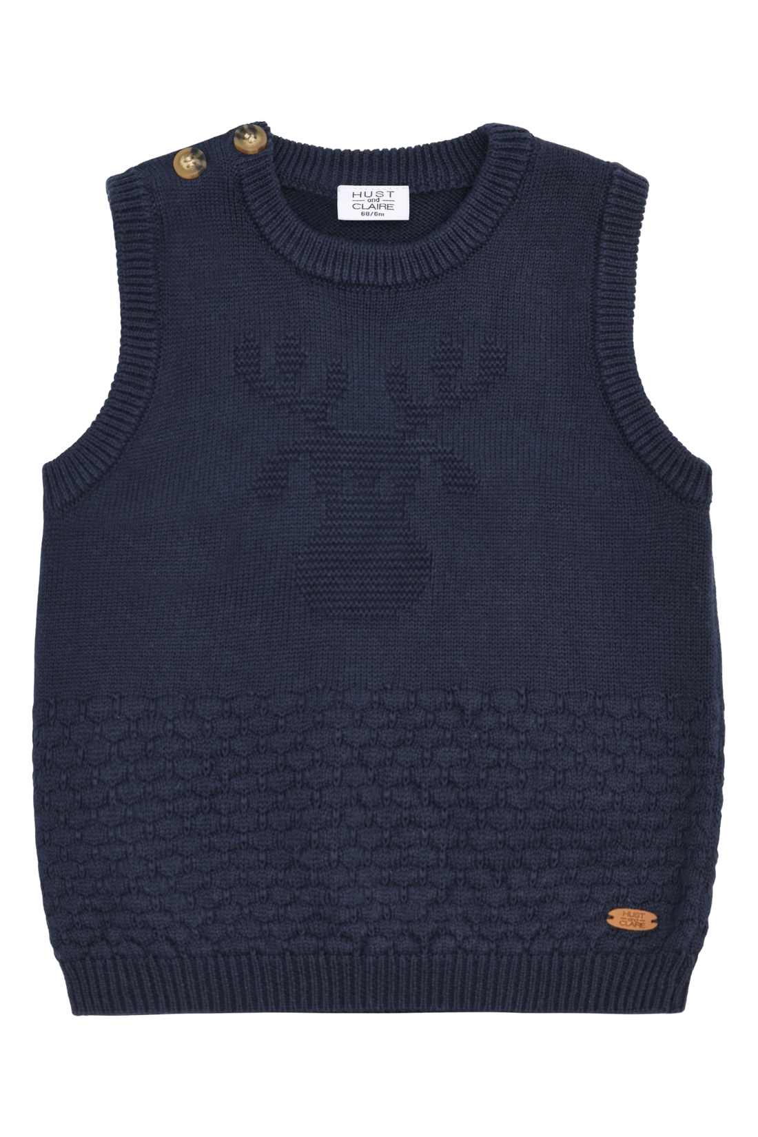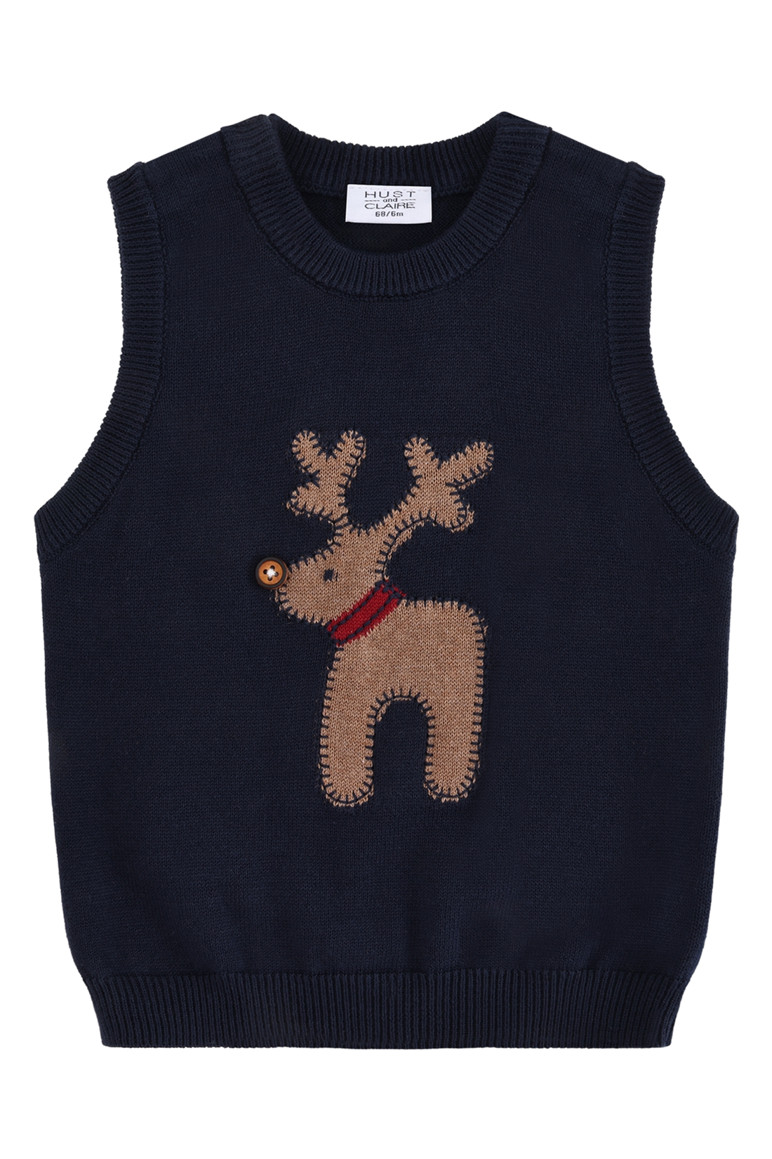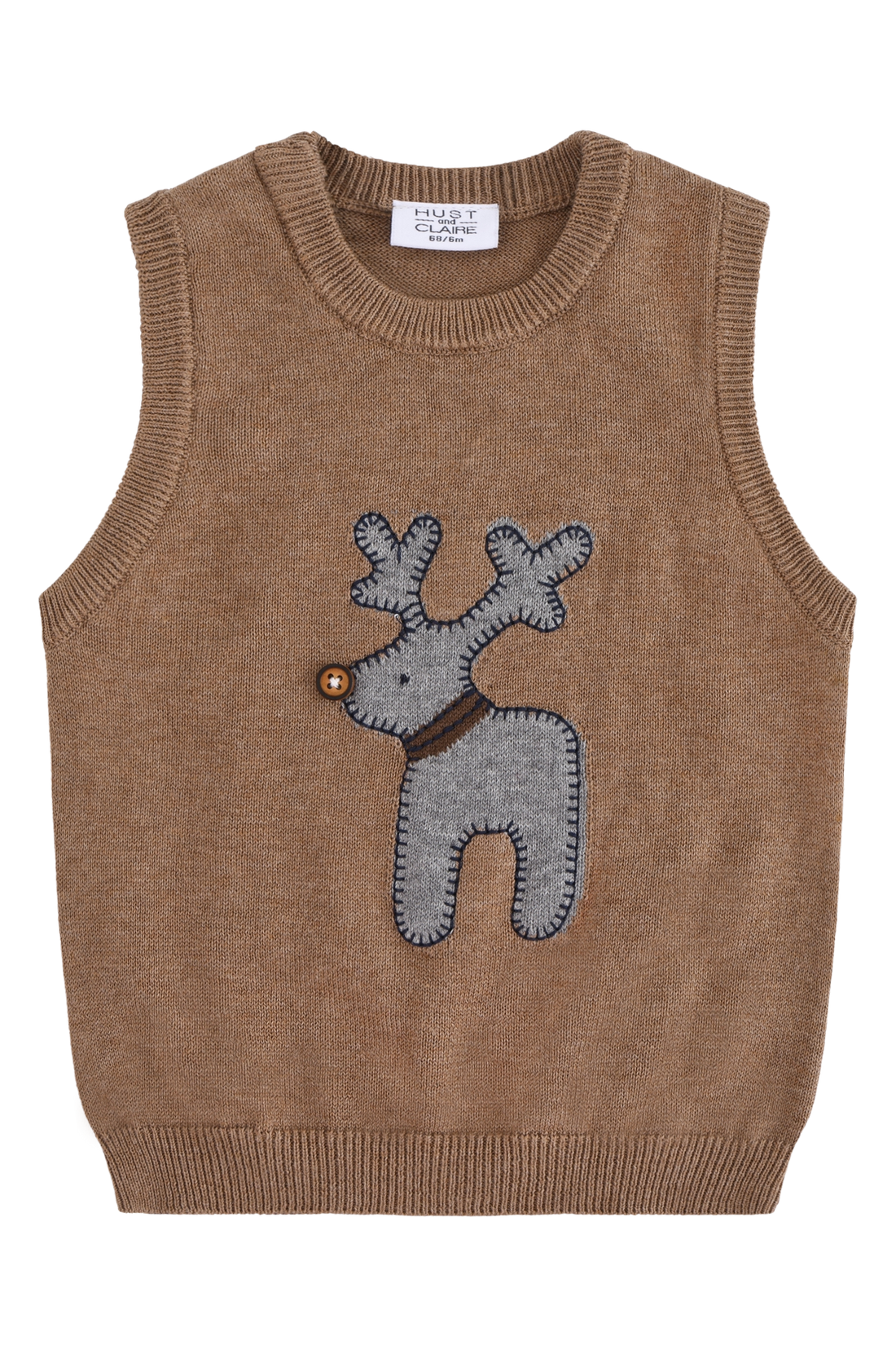 Glattstrikket vest i myk bomull med reinsdyr motiv foran. Modellen har rund hals og ribbestrikkede...