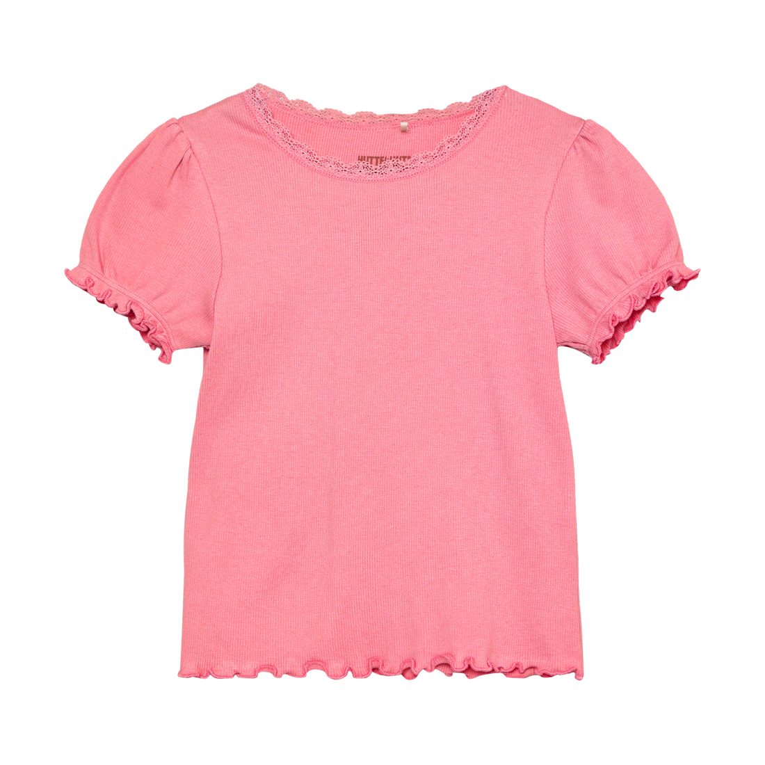 Søt T-skjorte fra HUTTEliHUT. Den runde halsen har en rysjekant, og ermeåpningen og bunnen er...