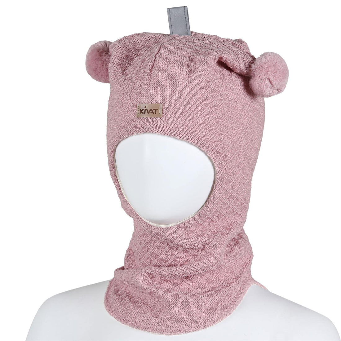 KIVAT-balaklava i ull laget av vakker tredimensjonal vaffelstrikk. KIVAT-merke og bobler. Det øverste laget av...