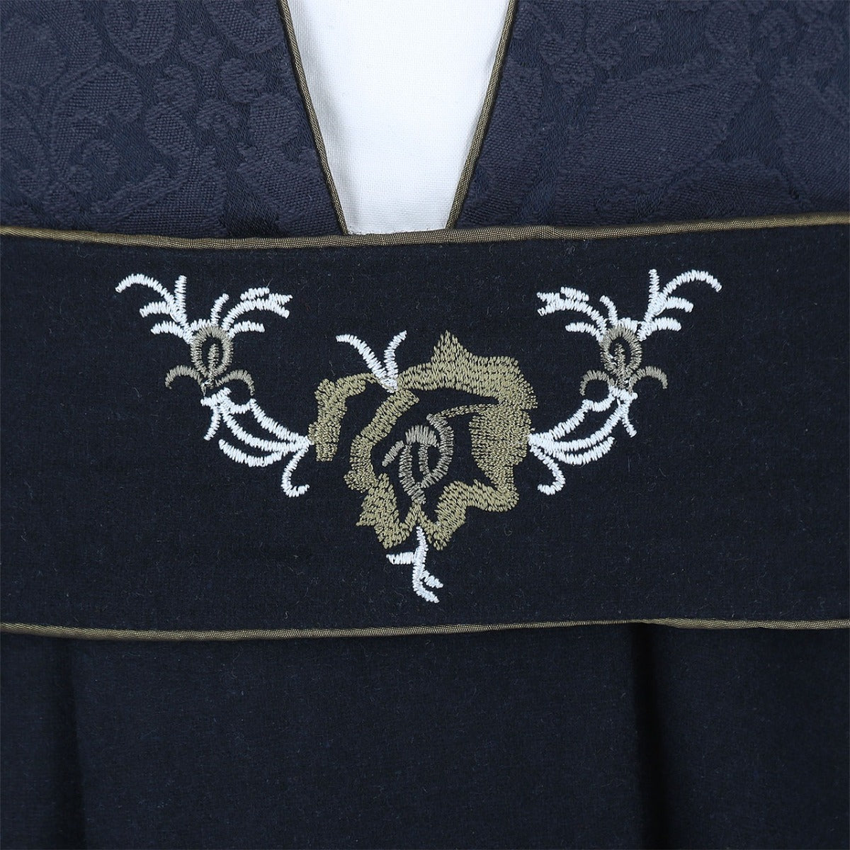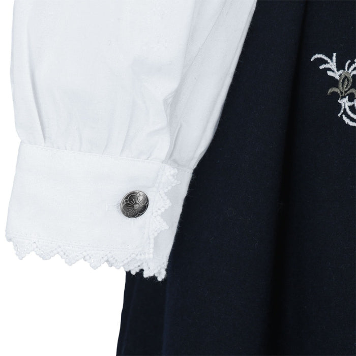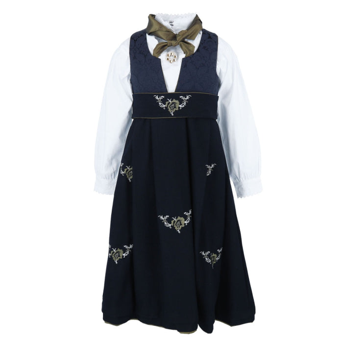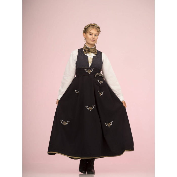 Gøril festdrakt har mørk marineblå stakk produsert i 65% ull og 35% viskose. Stakken har pene broderier i hvitt og oliven, har god vidde og faller fint. Ett legg nederst som kan fjernes dersom man ønsker en sidere stakk, dette vil da utgjøre 5cm ekstra lengde. Stakken har olivenfarget satengkant nederst som matcher detaljer man finner i ellers på drakten. Drakten har underskjørt i 100% polyester.