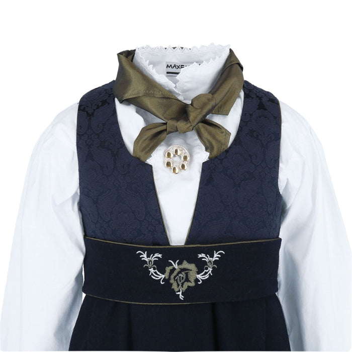 Gøril festdrakt leveres med et sateng trekant-tørkle i en vakker olivenfarge.