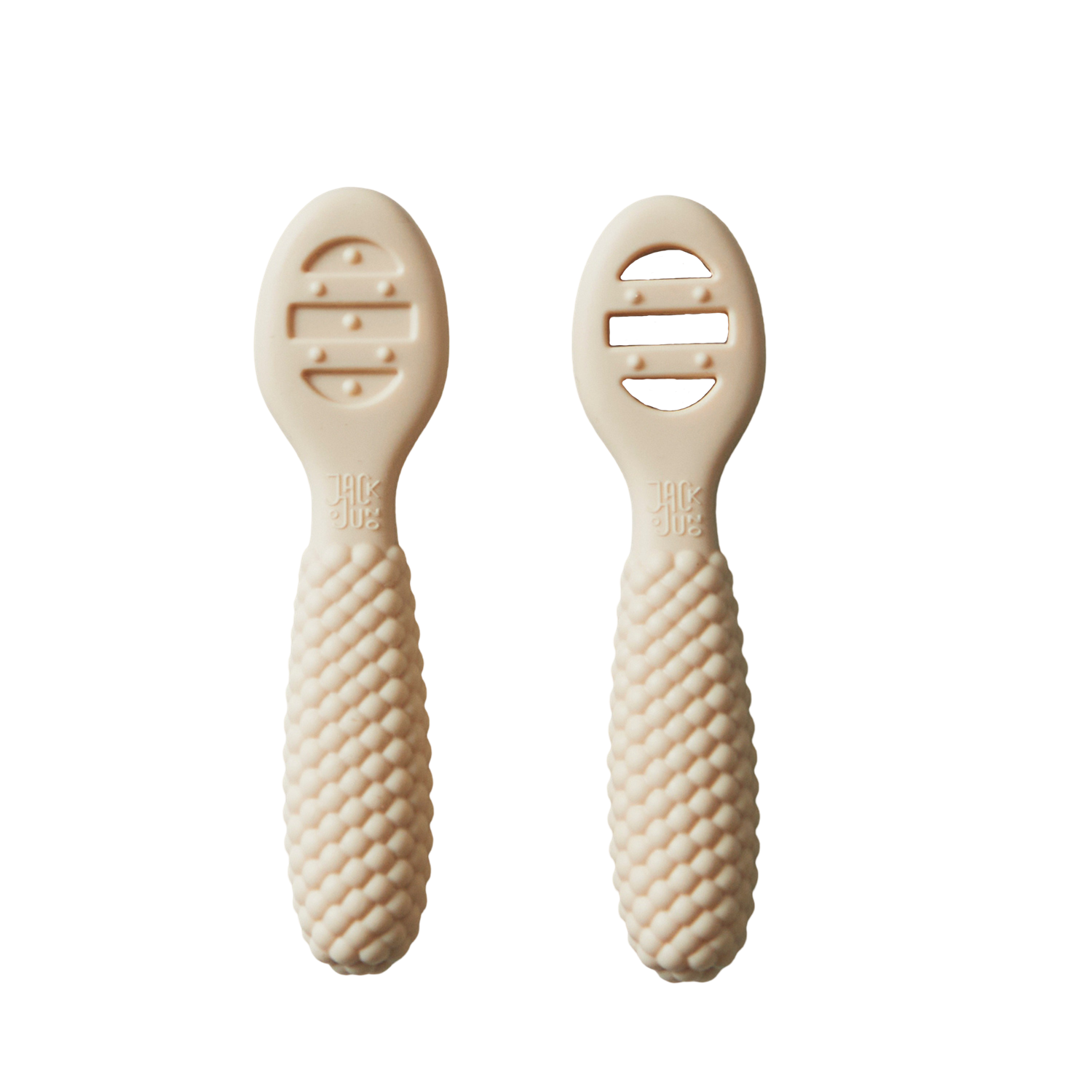 Våre pre-skjeer er laget for å lette babyens reise til selvmating. Trinn 1 har en solid overflate, perfekt for glatte puréer. Når den lille vokser, kan de gå over til trinn 2, som har åpne spor for å skaffe tykkere matvarer som potetmos. Begge skjeene har sensoriske prikker på sidene, noe som gir mild lettelse for tannkjøttet. Den sprudlende designen gjør det enkelt for små hender å ta tak i.