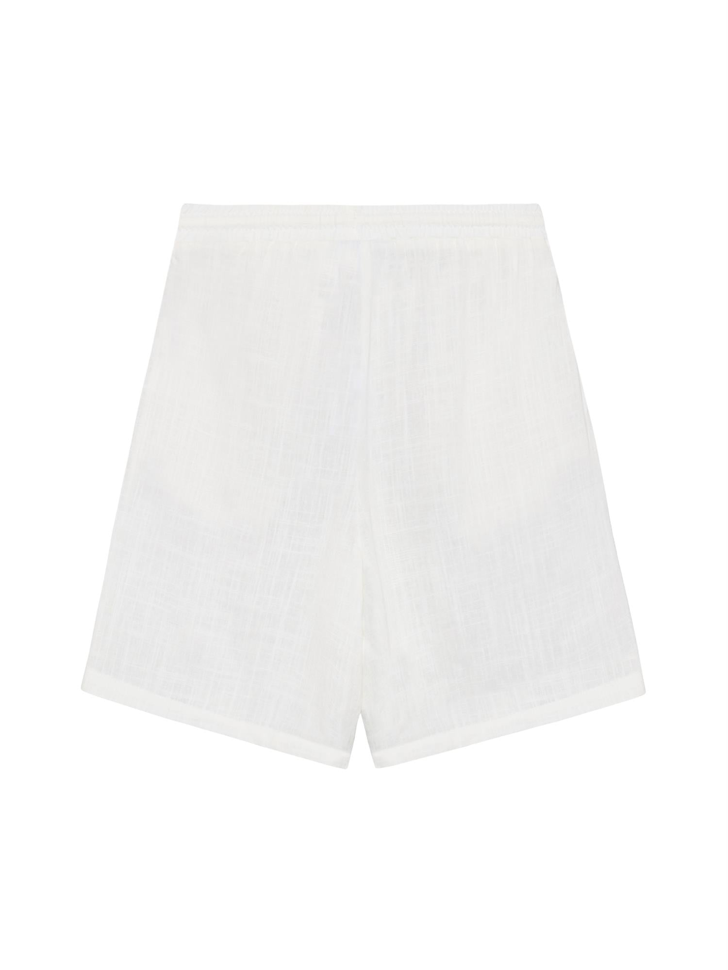 Linshorts med elastisk midje og skrå lommer. Myk blandet kvalitet med lin. Løs passform