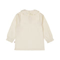 Søt langermet topp med en fin liten krage og strikk på ermene, som gir en leken og sjarmerende detalj. Ideell å kombinere med andre plagg for en komplett, søt look.