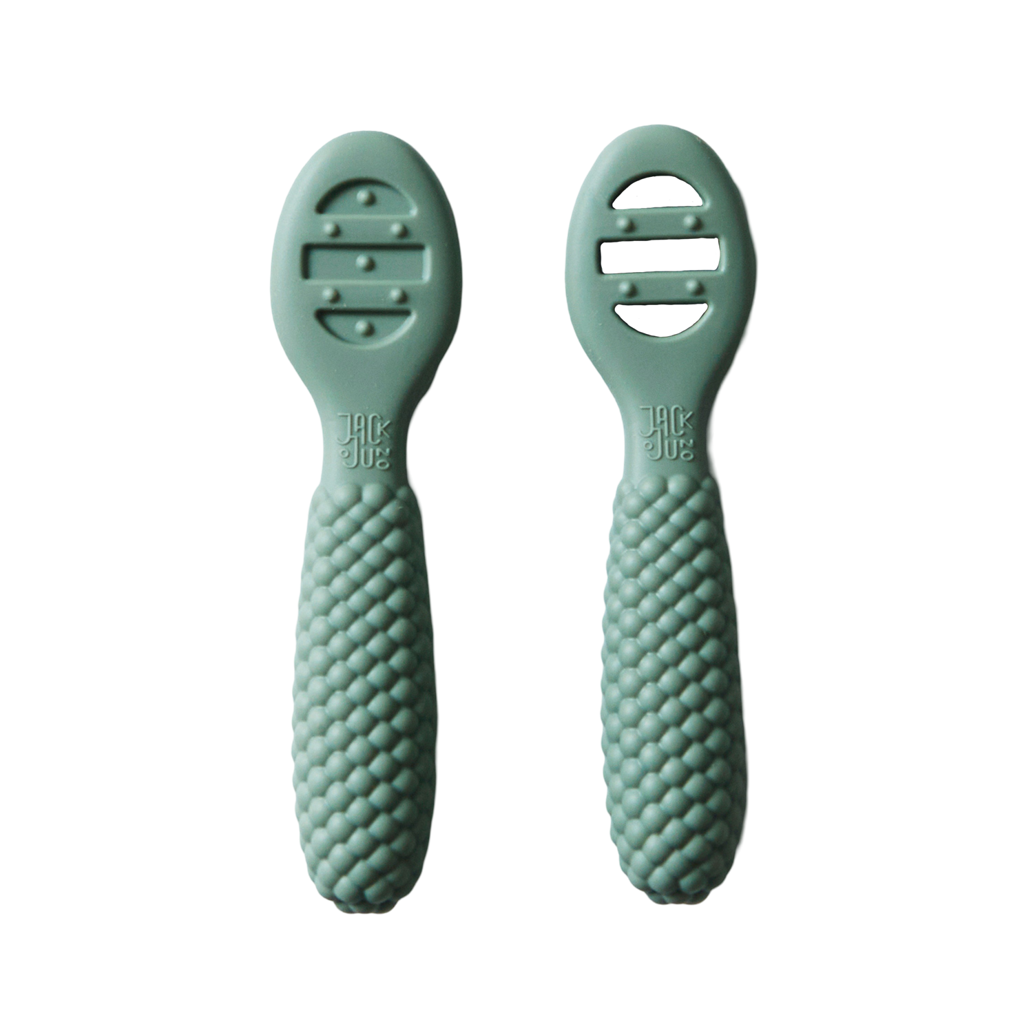 Våre pre-skjeer er laget for å lette babyens reise til selvmating. Trinn 1 har en solid overflate, perfekt for glatte puréer. Når den lille vokser, kan de gå over til trinn 2, som har åpne spor for å skaffe tykkere matvarer som potetmos. Begge skjeene har sensoriske prikker på sidene, noe som gir mild lettelse for tannkjøttet. Den sprudlende designen gjør det enkelt for små hender å ta tak i.