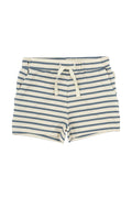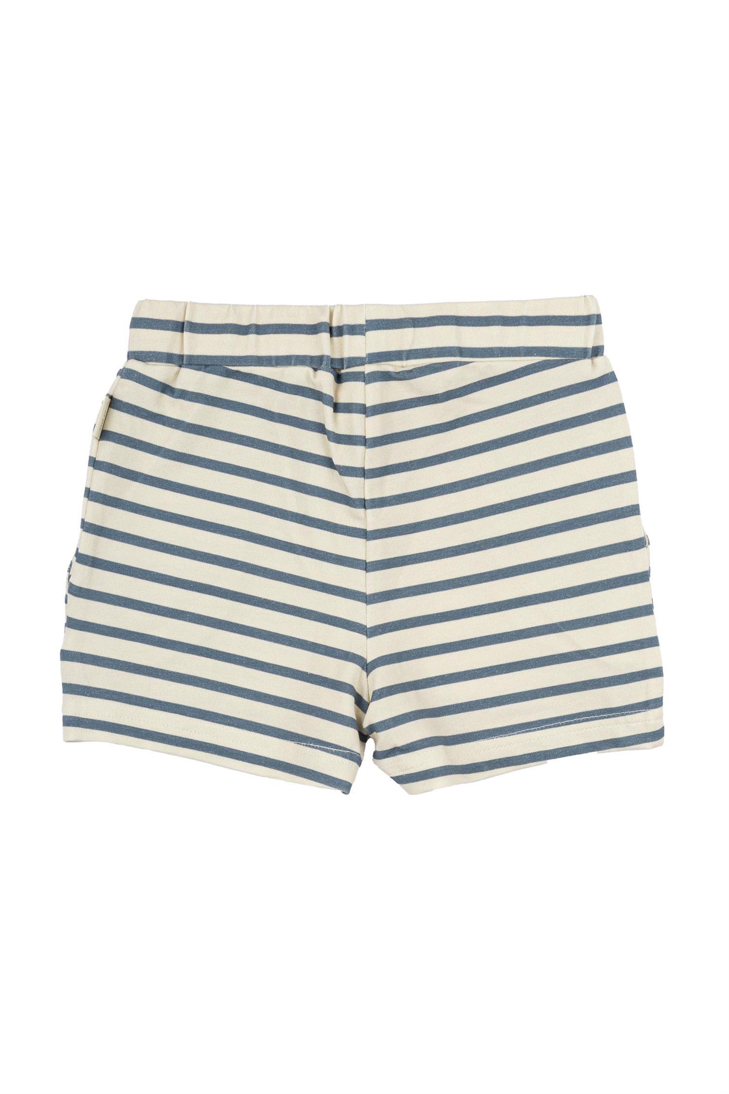 Petit Piao stripete shorts med de klassiske stripene i økologisk bomull. Stripene er i to farger, hvor grunnfargen er en kremfarge, så stripene beholder sitt klassiske utseende. Shortsen har en god strikkkant ved buksekanten med hvite knyter for justering i midjen.