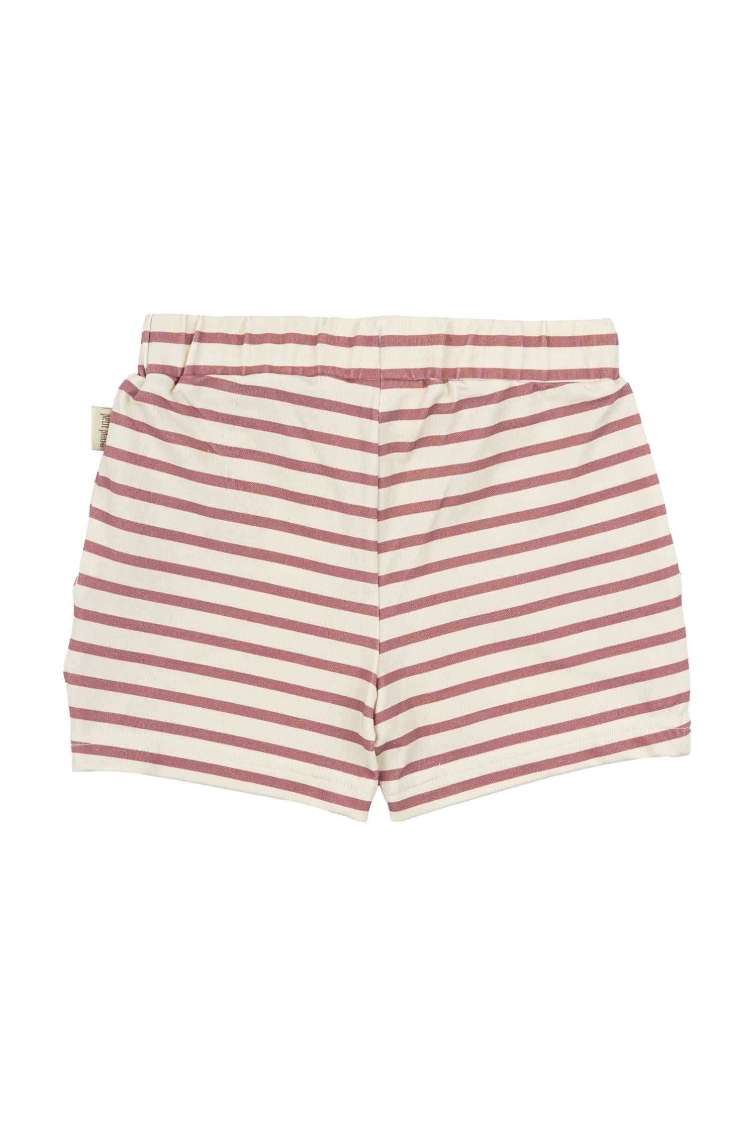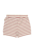 Petit Piao stripete shorts med de klassiske stripene i økologisk bomull. Stripene er i to farger, hvor grunnfargen er en kremfarge, så stripene beholder sitt klassiske utseende. Shortsen har en god strikkkant ved buksekanten med hvite knyter for justering i midjen.