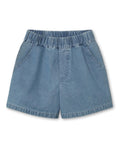 Korte denimshorts med strikk i midjen, lommer i sidesømmen for å oppbevare det spennende barnet finner på sin vei. Shortsen har mye volum, noe som gjør den behagelig å ha på seg, men også lett å spille i.