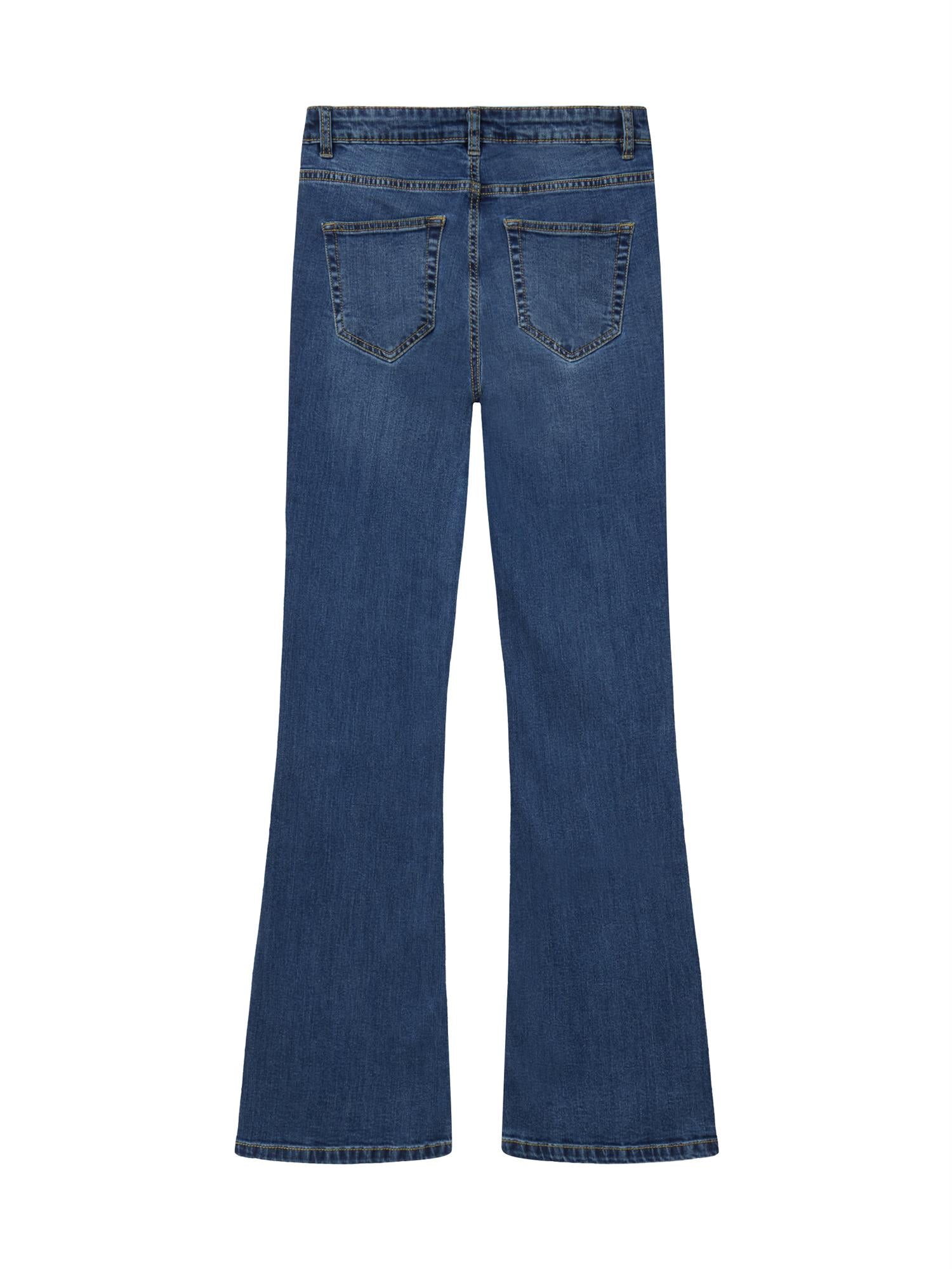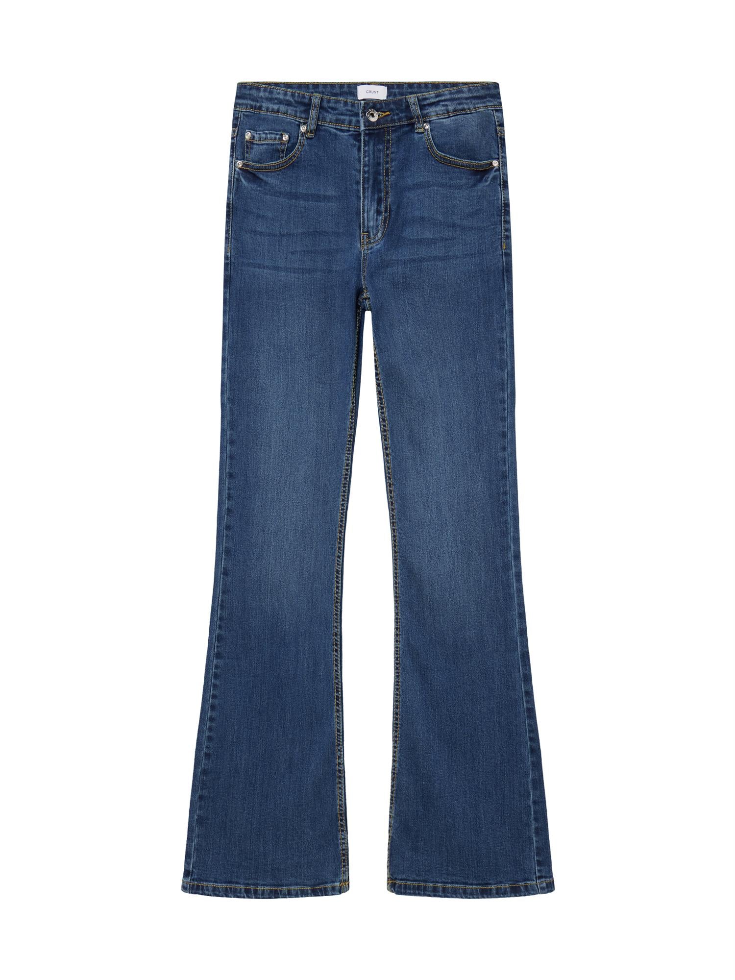 Texas slengbukser i mørkeblå vask, med fem lommer og glidelås-/knapplukking. Løse fra kne til ankel. Tettsittende passform ved lårene. Myk bomullskvalitet med stretch.