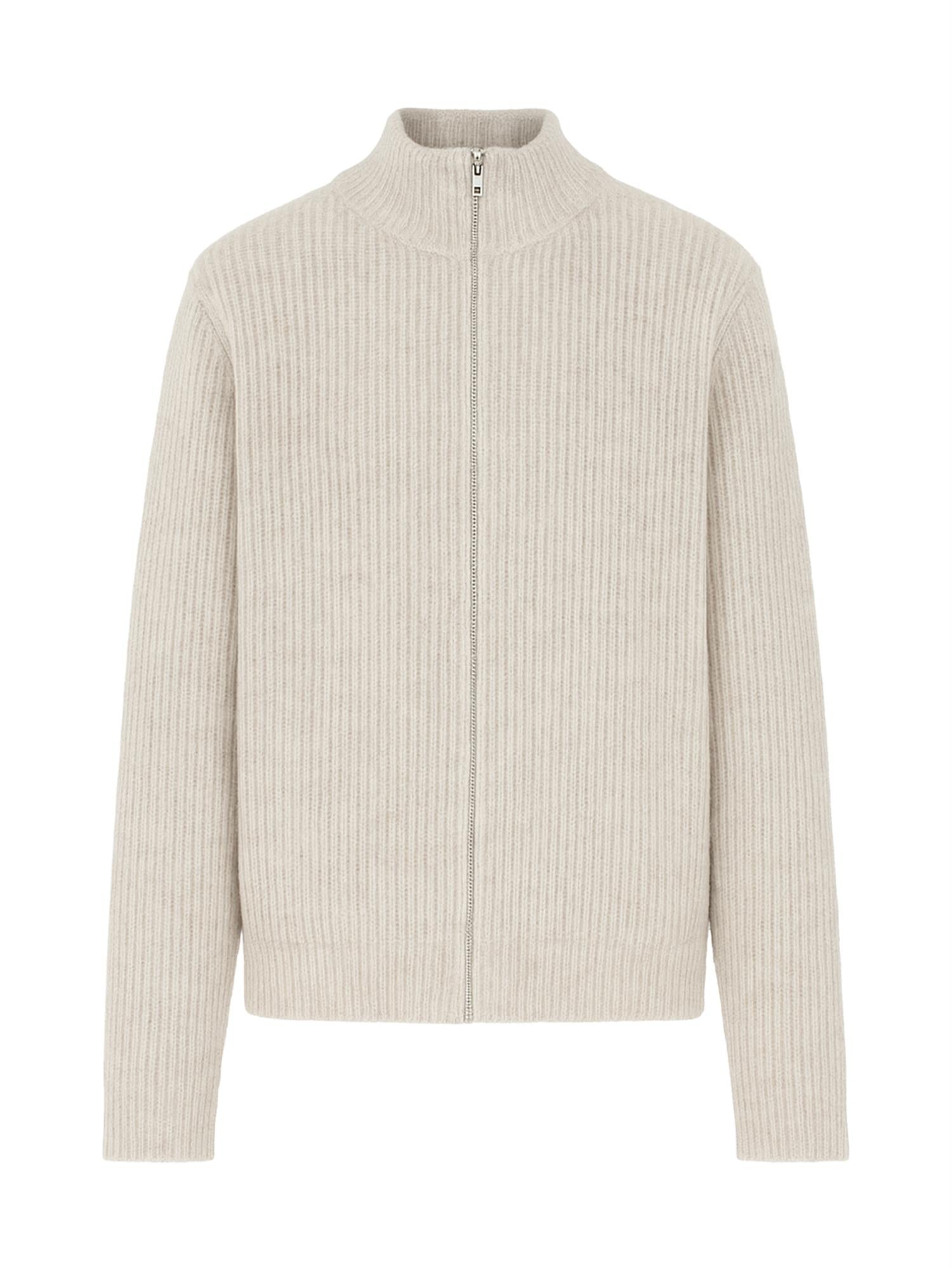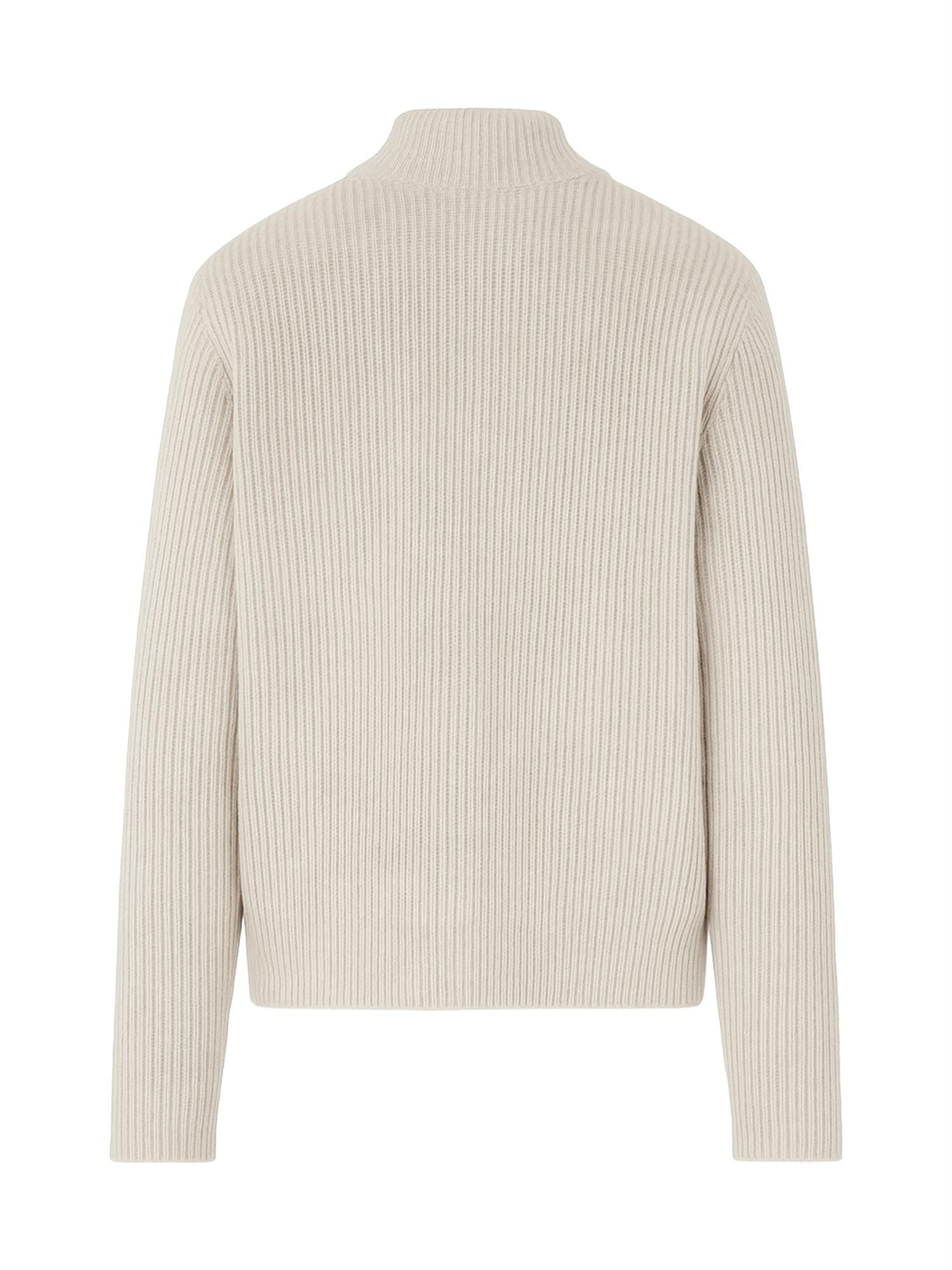 Gotfred strikkeplagg med glidelås, ribbekanter og halvhøy hals.