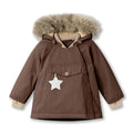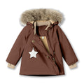 Ikonisk MINI A TURE vinterjakke med 10 års garanti. Vind- og vanntett, pustende og testet for å holde varmen ned til -25 grader Celsius. Jakken åpnes foran med en skjult, skrå glidelås og har et mykt fleecefôr. Hetten er avtakbar og den ekte pelsen kan enkelt fjernes med en skjult glidelås. Ermene har forbedret passform som sikrer bevegelsesfriheten samt snømansjetter ved håndleddene med tommelåpning. Midjen er justerbar fra innsiden. Størrelser til og med størrelse 86 cm (18m) har vrangbord rundt halsen, mens de større størrelsene har vanlig krage.