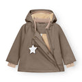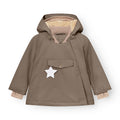 Ikonisk MINI A TURE vinterjakke. Vind- og vanntett, pustende, testet for å holde varmen ned til -25 grader Celsius. Jakken åpnes foran med en skjult, skrå glidelås og har et mykt fleecefôr. Hetten er avtakbar og kan justeres med en elastisk snor for å holde vinden ute. Ermene har forbedret passform som sikrer bevegelsesfriheten samt snømansjetter ved håndleddene med tommelåpning. Midjen er justerbar fra innsiden med en strikk. Størrelser til og med 86cm/18m har vrangbord rundt halsen, mens de større størrelsene har vanlig krage.