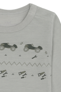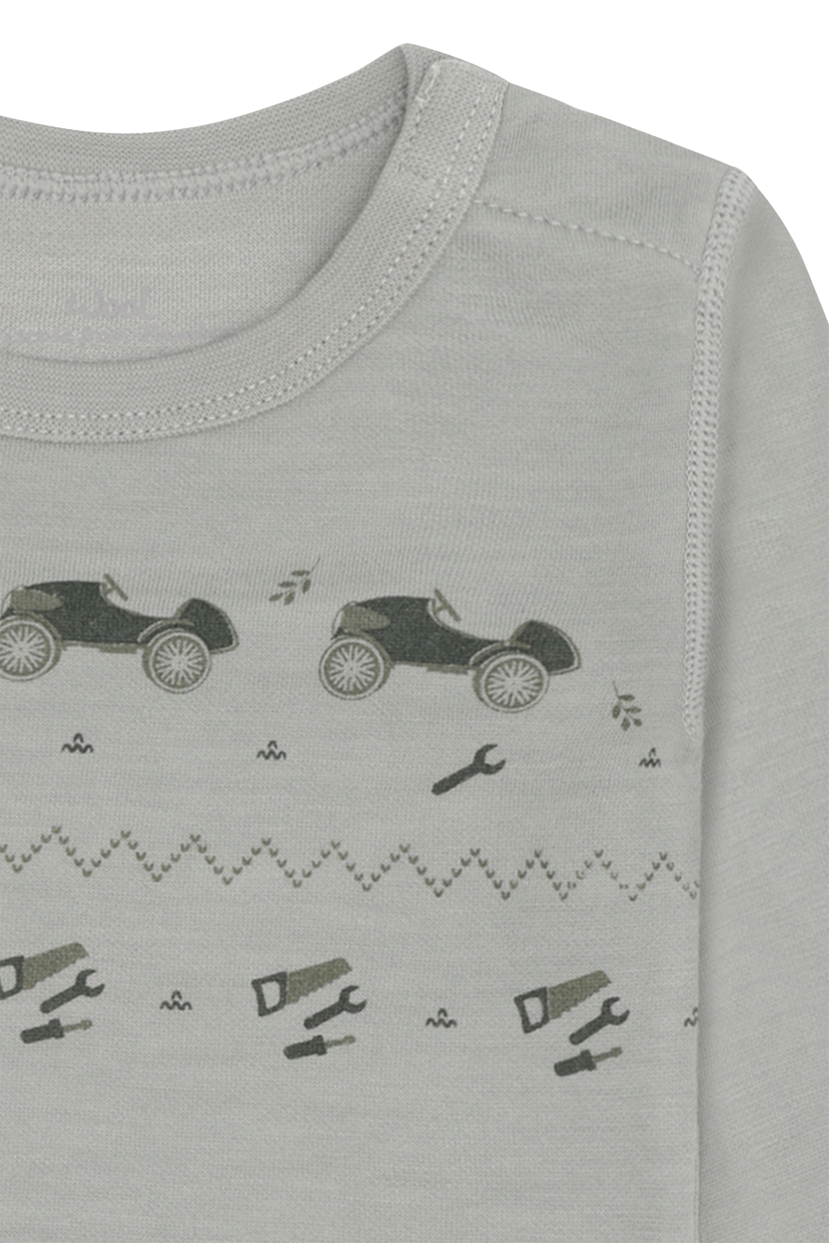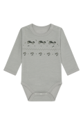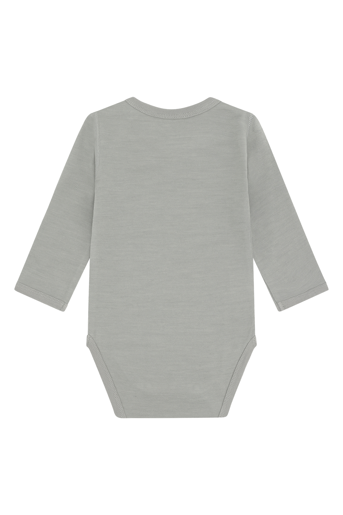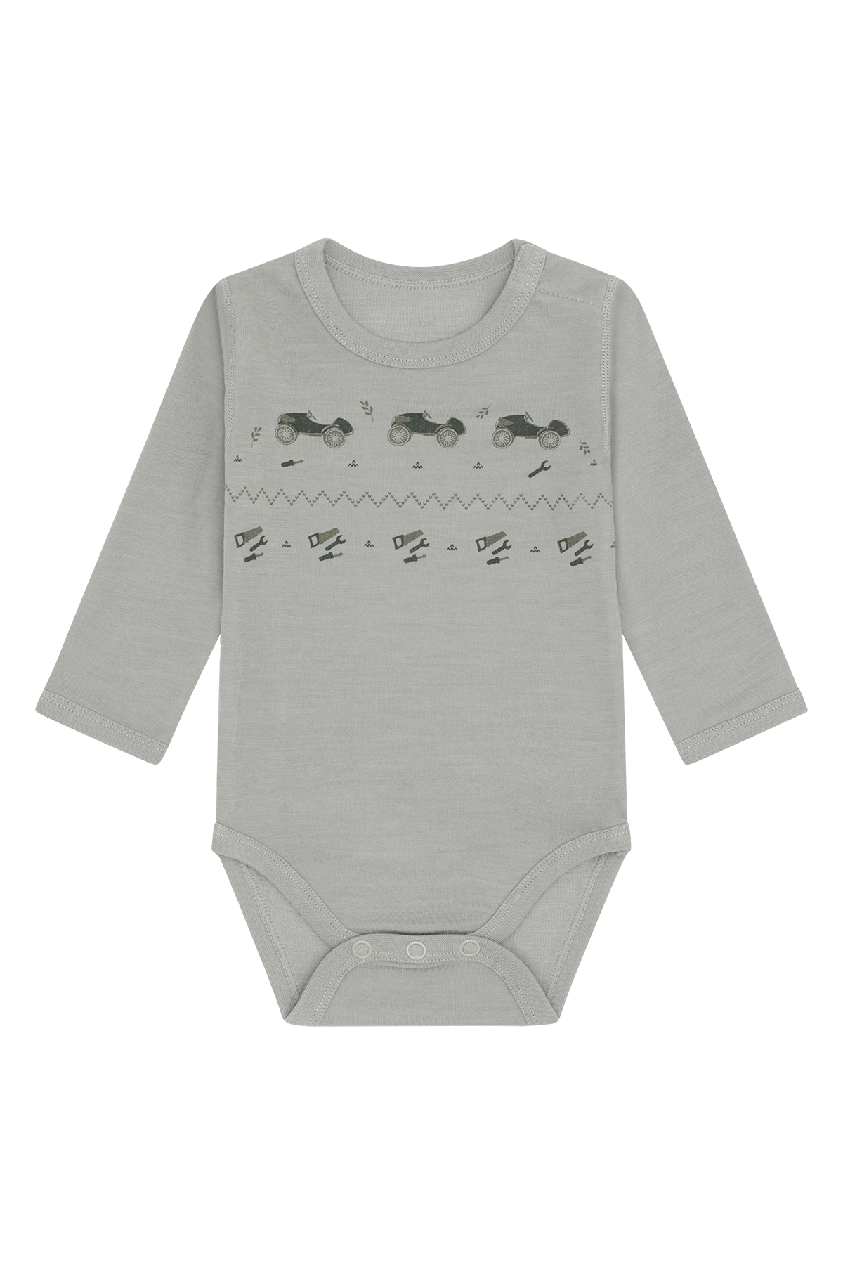 Langermet body i behagelig, elastisk ull- og bambuskvalitet med trykk. Kneppes på venstre skulder og mellom bena. Alt stoff som treffer huden er i bambus, slik at plagget også passer til de med sensetiv hud.