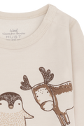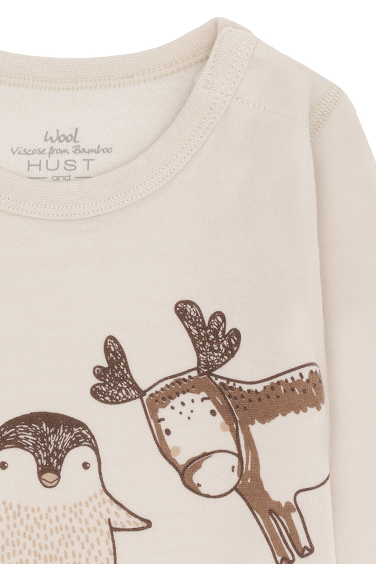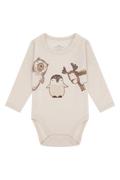 Langermet body i behagelig, elastisk ull- og bambuskvalitet med trykk. Kneppes på venstre skulder og mellom bena. Alt stoff som treffer huden er i bambus, slik at plagget også passer til de med sensetiv hud.