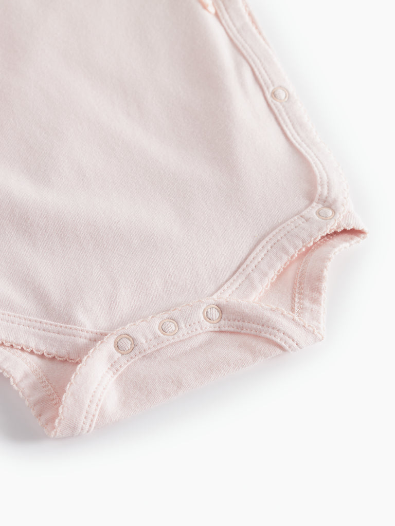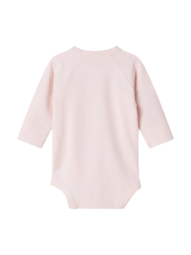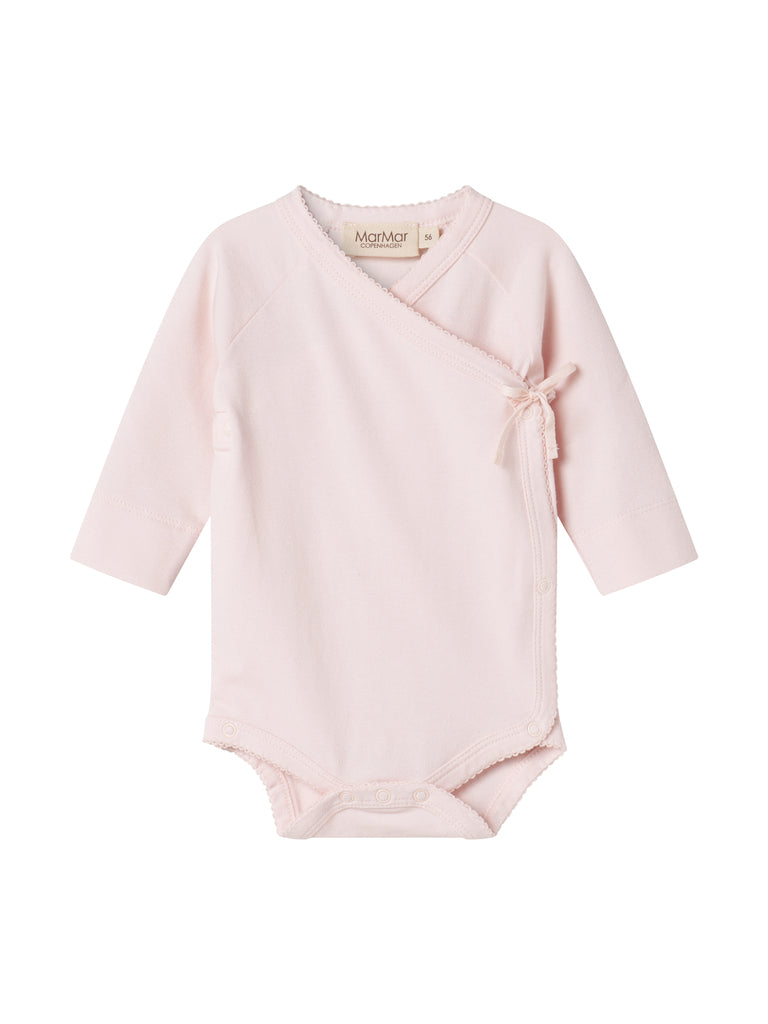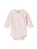 Langermet body med omslagslukking. Bodyen lukkes med trykknapper og knyting. Bodyen er myk, elastisk og behagelig å ha på.