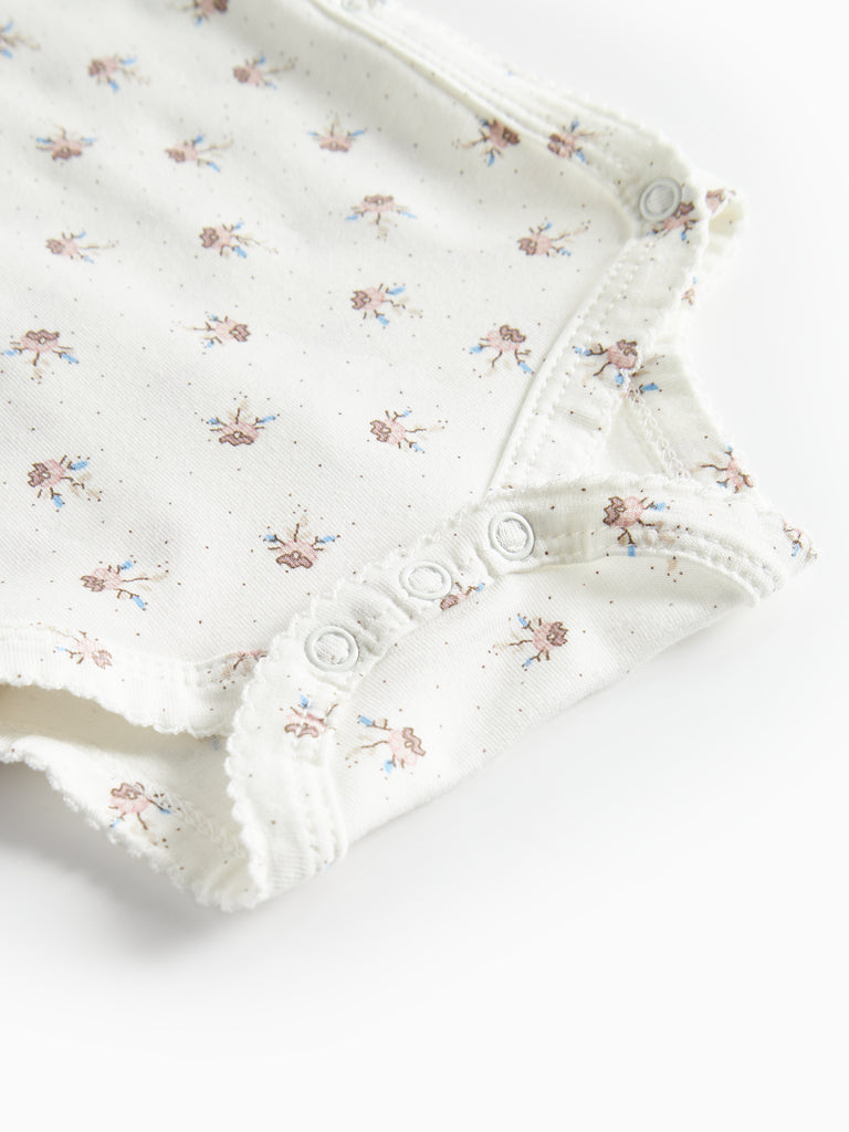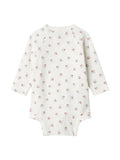 Langermet body med omslagslukking. Bodyen lukkes med trykknapper og knyting. Bodyen er myk, elastisk og behagelig å ha på.