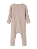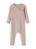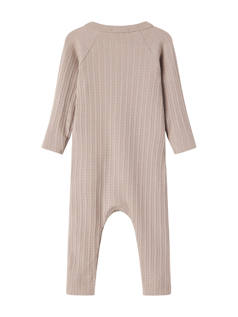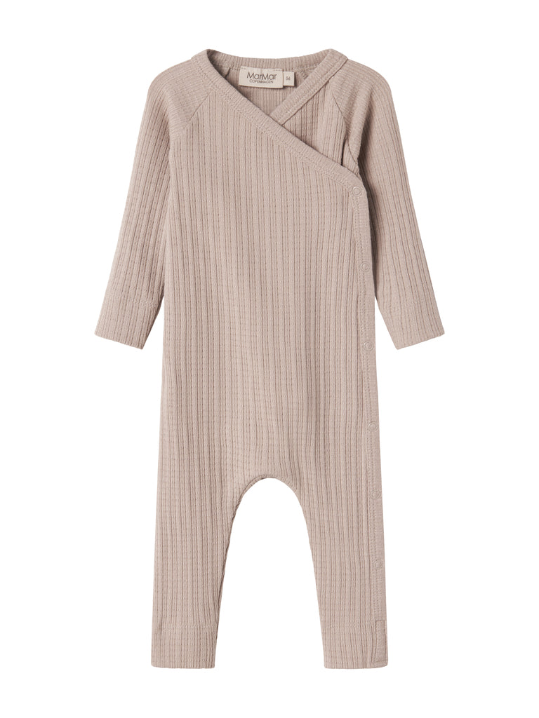 Langermet jumpsuit med omslagslukking. Jumpsuiten lukkes med trykknapper fra halsen og ned det ene benet. Jumpsuiten er myk, elastisk og behagelig å ha på.