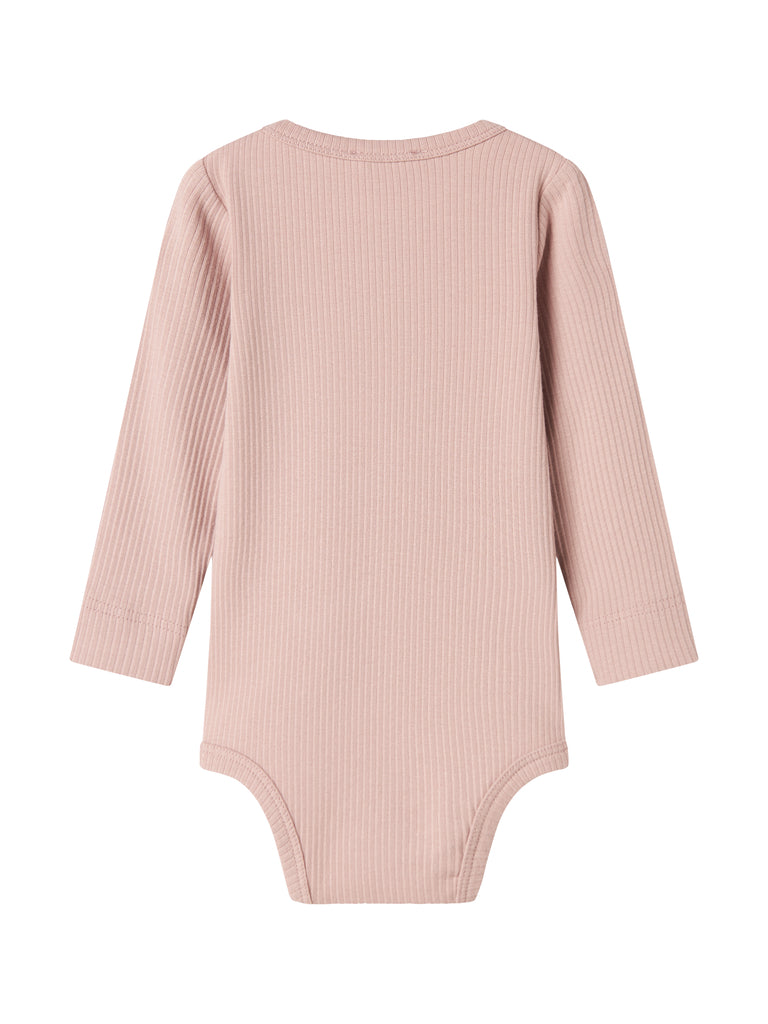 Langermet ribbestrikket body med knepping på den ene skulderen og mellom bena. Myk, elastisk og behagelig å ha på. 100% naturlig materiale og pustende kvalitet.