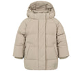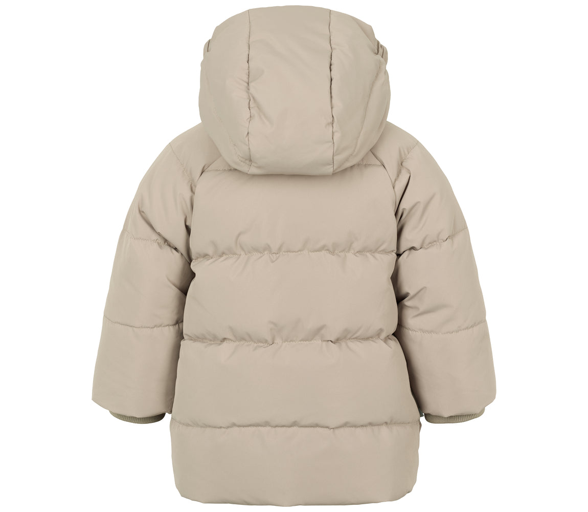 Dunjakke for de minste, designet for å holde barnet varmt og komfortabelt i de kalde månedene. Jakken har en avtakbar hette, to funksjonelle skråstilte sidelommer hvor hendene kan holdes varme eller små gjenstander kan oppbevares. Dunjakken lukkes med en skjult glidelåslukking foran med en bred stormklaff som lukkes med trykknapper, noe som gir ekstra beskyttelse mot vind og kulde. Jakken sitter tett rundt håndleddene, slik at ingen kulde trenger inn. Dunjakken er ideell for både hverdagsbruk og utendørsaktiviteter der barnet trenger en varm, slitesterk og stilig jakke.