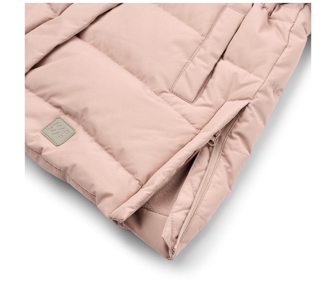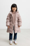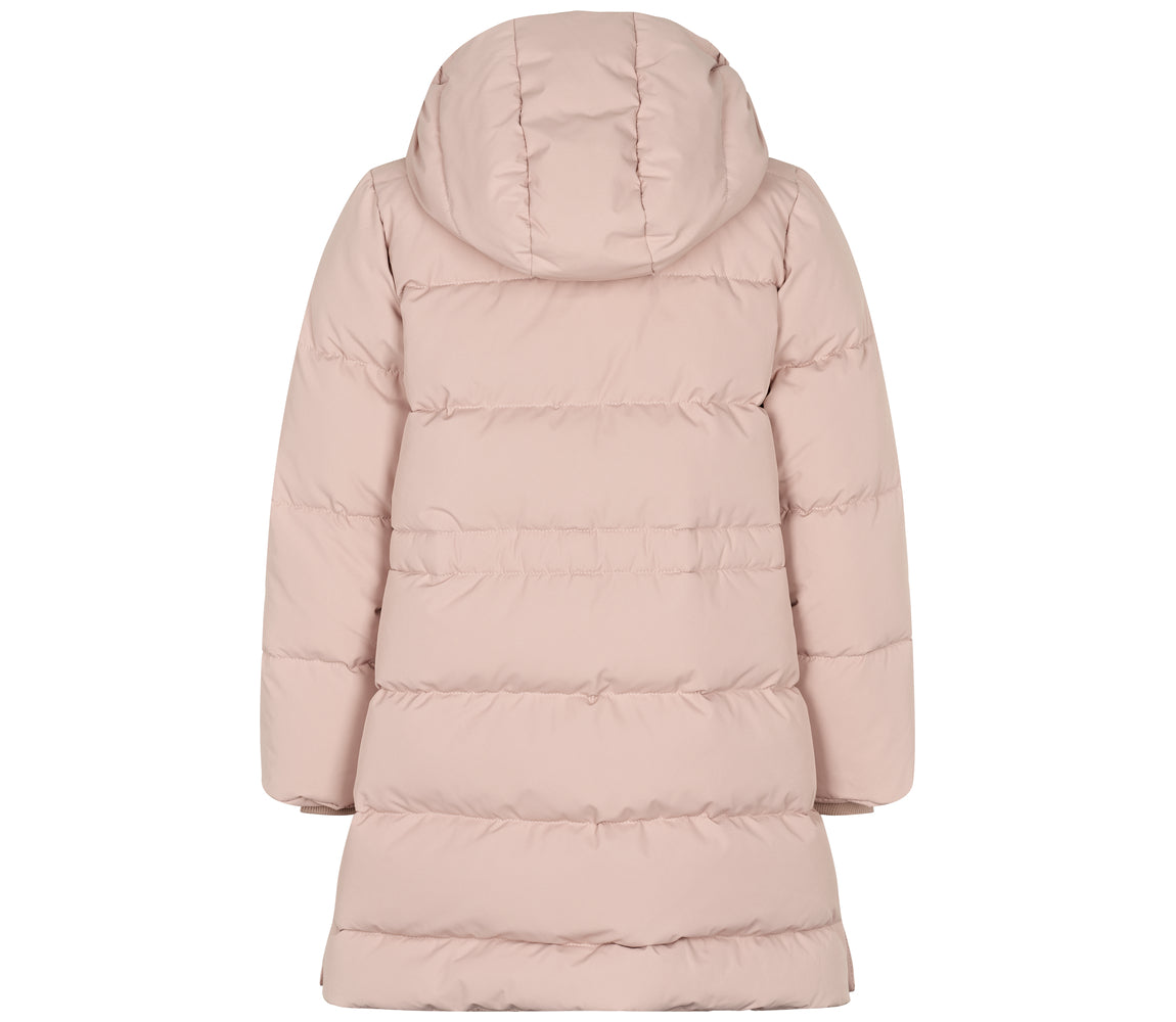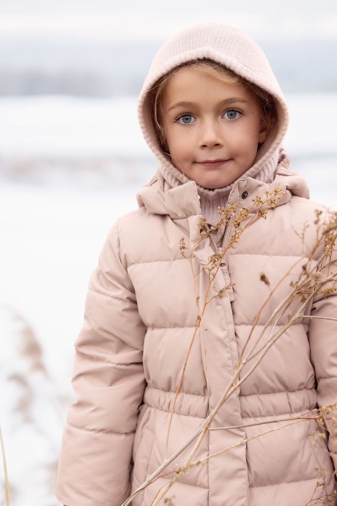 Lang og komfortabel dunjakke designet for å holde barnet ditt varmt og komfortabelt i de kalde månedene. Jakken har en lengre passform som gir ekstra beskyttelse mot kulde og vind. Dunjakken har elastikk på innsiden som kan strammes i midjen for et mer feminint utseende. Jakken har to skråstilte sidelommer hvor hendene kan holdes varme eller små gjenstander kan oppbevares. Dunjakken har en avtakbar hette, glidelåser på sidene som kan åpnes for å øke bevegelsesfriheten, noe som gjør jakken ideell for aktiv lek og utendørseventyr. Dunjakken lukkes med en skjult glidelåslukking og trykknapper foran som gir ekstra beskyttelse mot kulde og vind.