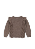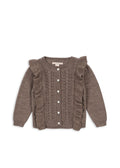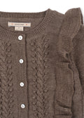 Myk og varm cardigan med intrikate strikkedetaljer og volanger. Lukkes med perlemorknapper foran.
