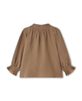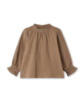 Bluse i myk, vevd muslinkvalitet. Blusen har strikk i halsen som gir et vakkert fall, samt lange ermer med strikk og rysjer nederst. Blusen sitter fint løst, noe som gjør den perfekt for lek samtidig som den ser fin ut.