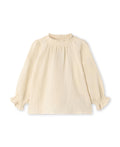 Bluse i myk, vevd muslinkvalitet. Blusen har strikk i halsen som gir et vakkert fall, samt lange ermer med strikk og rysjer nederst. Blusen sitter fint løst, noe som gjør den perfekt for lek samtidig som den ser fin ut.