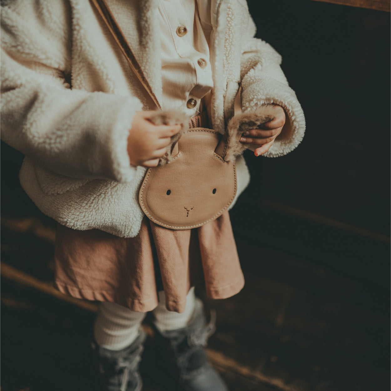 Hvilke små skatter vil den lille oppbevare i Britta-vesken sin? Denne eksklusive vesken har et søtt, fluffy kanindesign med myke, pelskledde detaljer. Komplett med en justerbar stropp og glidelåslukking bak, noe som gjør den superenkel for de små fingrene å åpne og lukke den. Britta er laget av 100 % premium kuskinn og er et søtt første tilbehør.