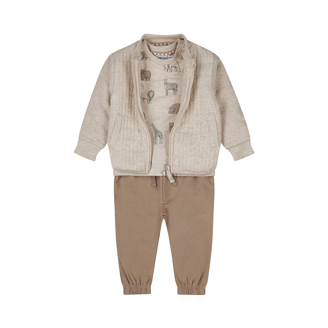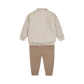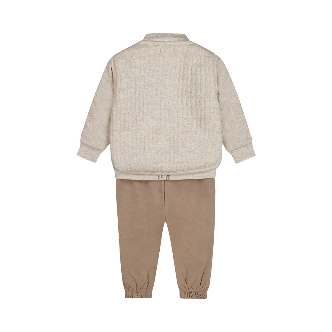 Dette guttesettet fra Dirkje er det perfekte valget for høst og vinter. Cardiganen i gråbrun melange har en fin tekstur i stoffet og er herlig varm. Den matchende langermede genseren med et kult dyretrykk fullfører settet. De myke joggebuksene i myk brun har elastisk linning og strikk i beina for ekstra komfort og perfekt passform. Det ideelle settet for den lille å leke og være komfortabel i.
