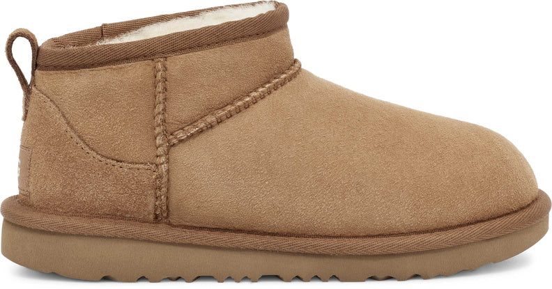 K Classic Ultra Mini fra UGG er en lav og allsidig versjon av den ikoniske UGG-Skoen – perfekt for aktive barn som trenger komfort hele dagen. Den korte skaftlengden gjør den enkel å ta av og på, mens det ultramyke fôret i ekte saueskinn og UGGplush™-innleggssåle sørger for lun varme og en myk følelse mot foten.