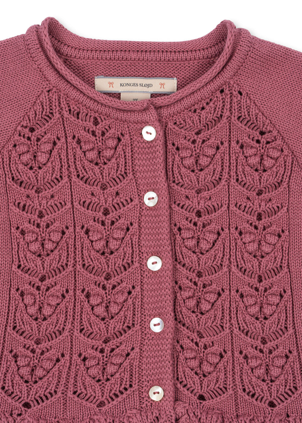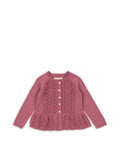 Myk cardigan designet med rullekantutringning og volangdetaljer. Avsluttet med et delikat strikkemønster med perlemorsknapper foran.