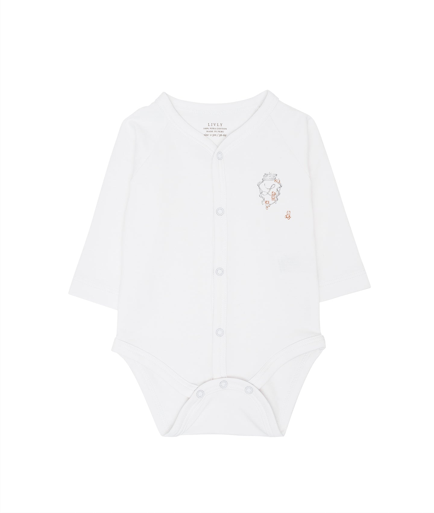 LIVLY body med lange ermer, rund hals og nikkelfrie trykknapper for enkel påkledning. Bodyen har et trykk av søte Teddy Tay. • Lange ermer • Nikkelfrie trykknapper.