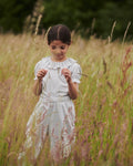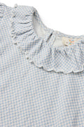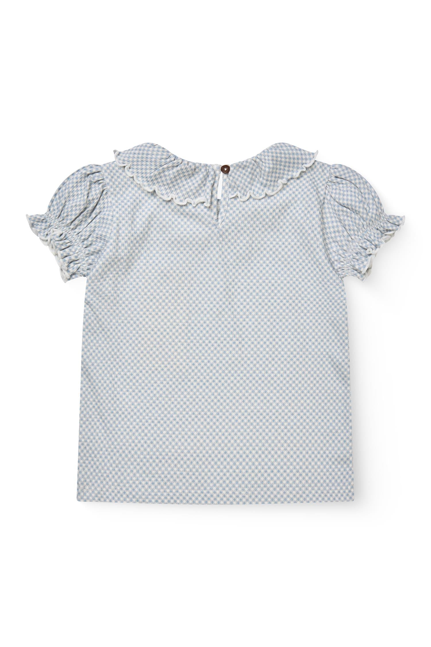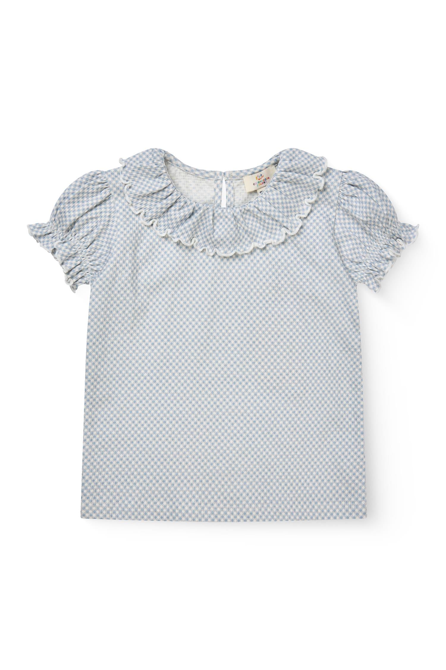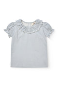 Søt topp med sjarmerende puffermer, en rysjekrage med delikate kanter og en nøkkelhullsknapplukking bak.