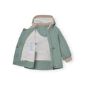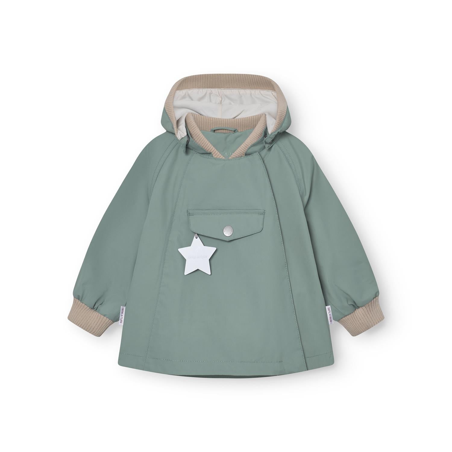 MINI A TURE WAI vårjakke i et lekkert og slitesterkt materiale. Nydelig teknisk vårjakke med skrå glidelåslukking og lomme på magen med den klassiske stjernerefleksen. Jakken har avtagbar hette og innvendig justerbar stramming. Den spisse hetten har en elastisk kanting som holder vind og regn ute. I ansiktsåpningen og på håndleddene er det en myk rib som føles behagelig mot huden. Jakken er vind- og vanntett, samtidig som at den puster og er derfor en super vårjakke!