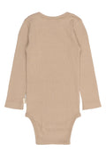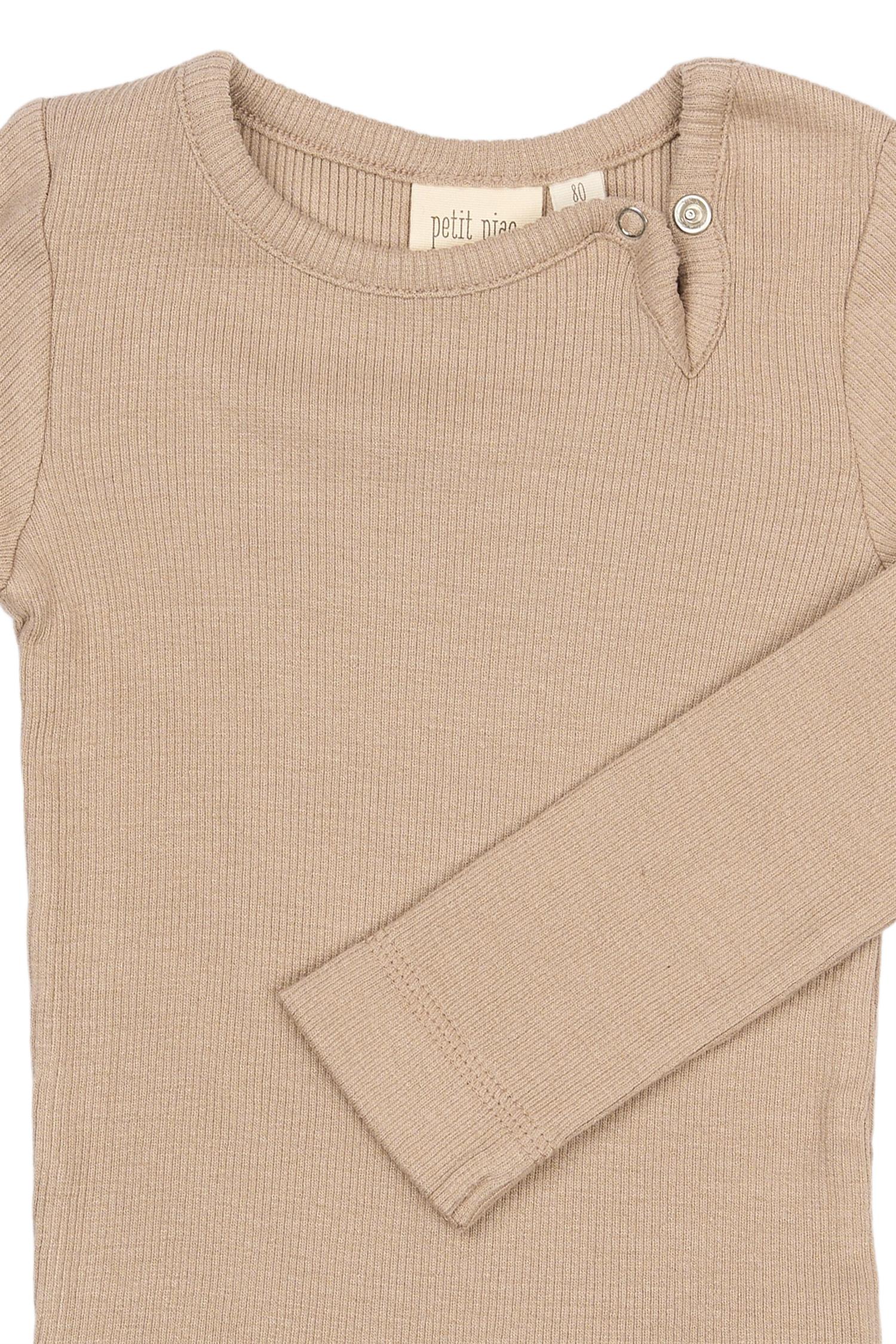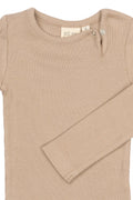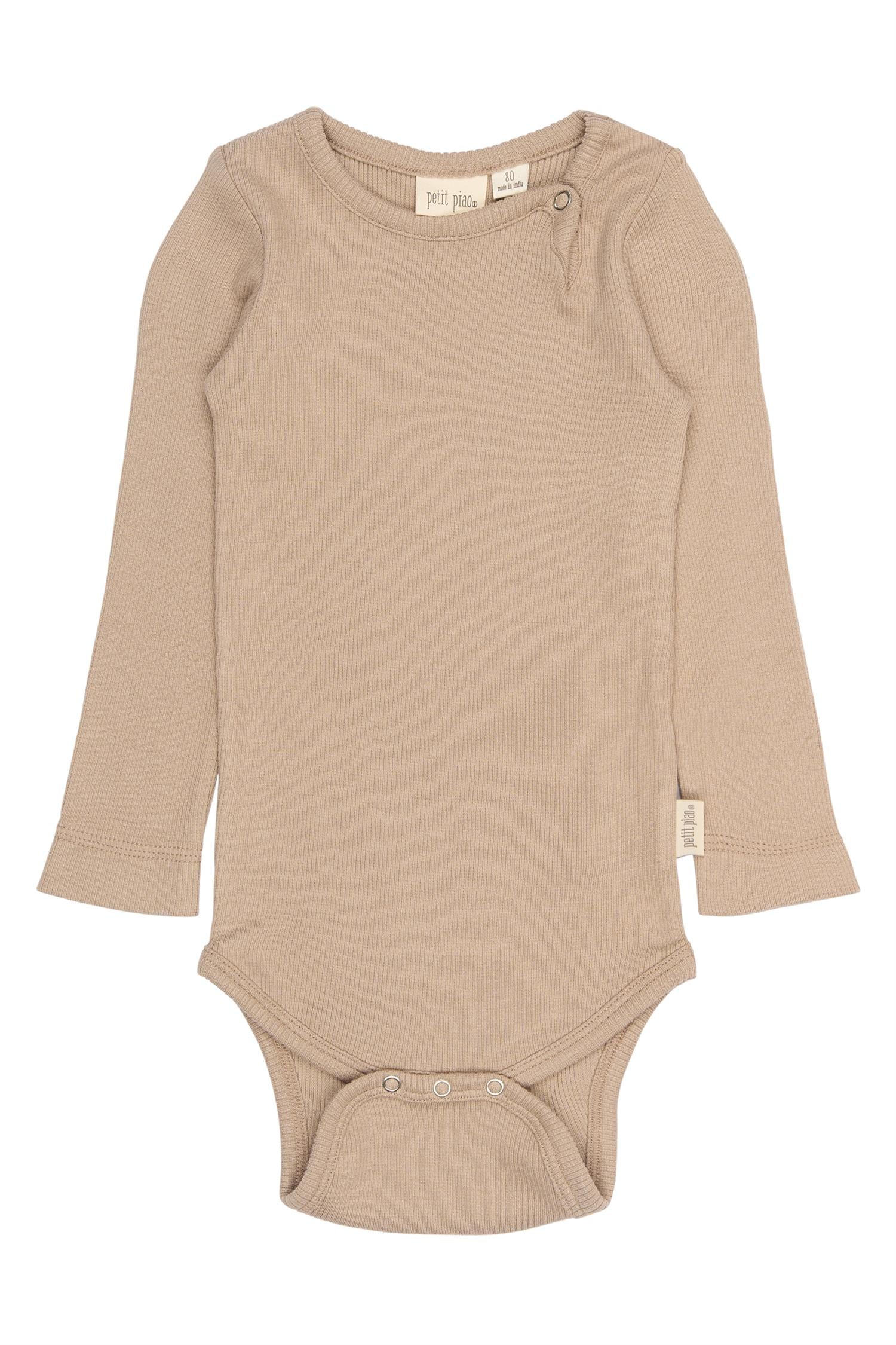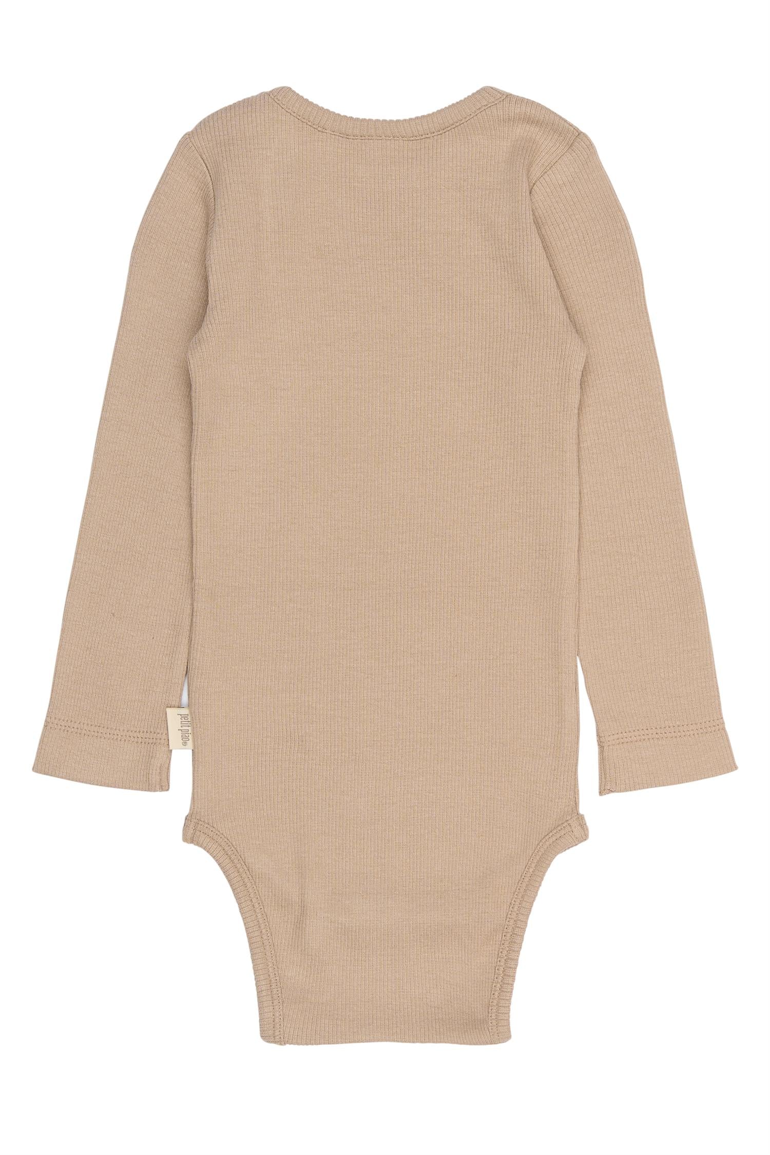 Langermet body i myk ribbekvalitet. På venstre side av halsåpningen har vi vår signaturåpning med trykknapp for enkel åpning. Kroppen lukkes nederst med tre trykknapper, for enkelt bleieskift. Materialet er mykt og veldig strekkbart, laget for komfort og lek.