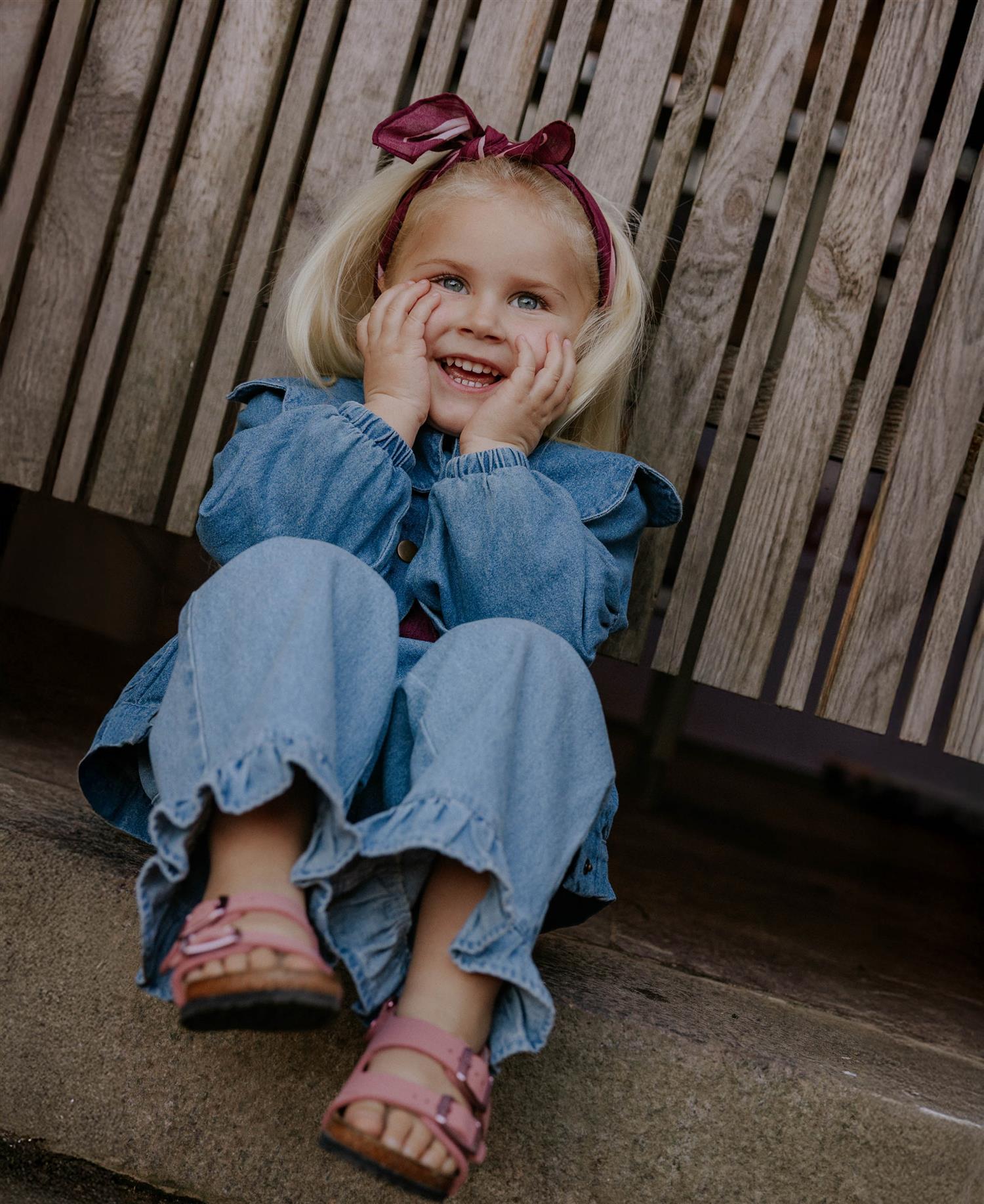 Denimbukser med feminine rysjedetaljer på lommer og buksekant. Buksene har en rett benskåring som skaper volum og bevegelsesfrihet. Bak har buksene lommer med søte broderte roser.