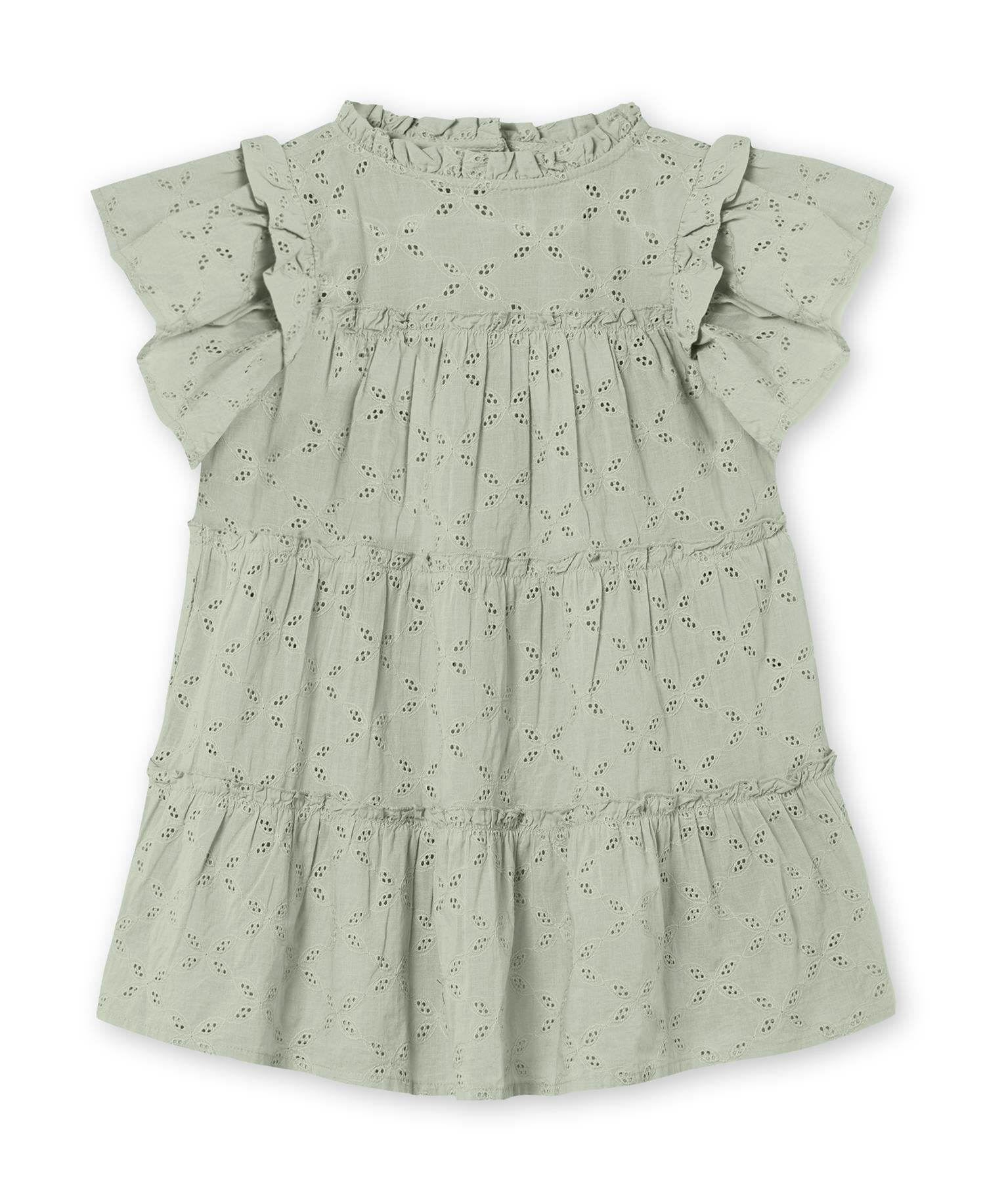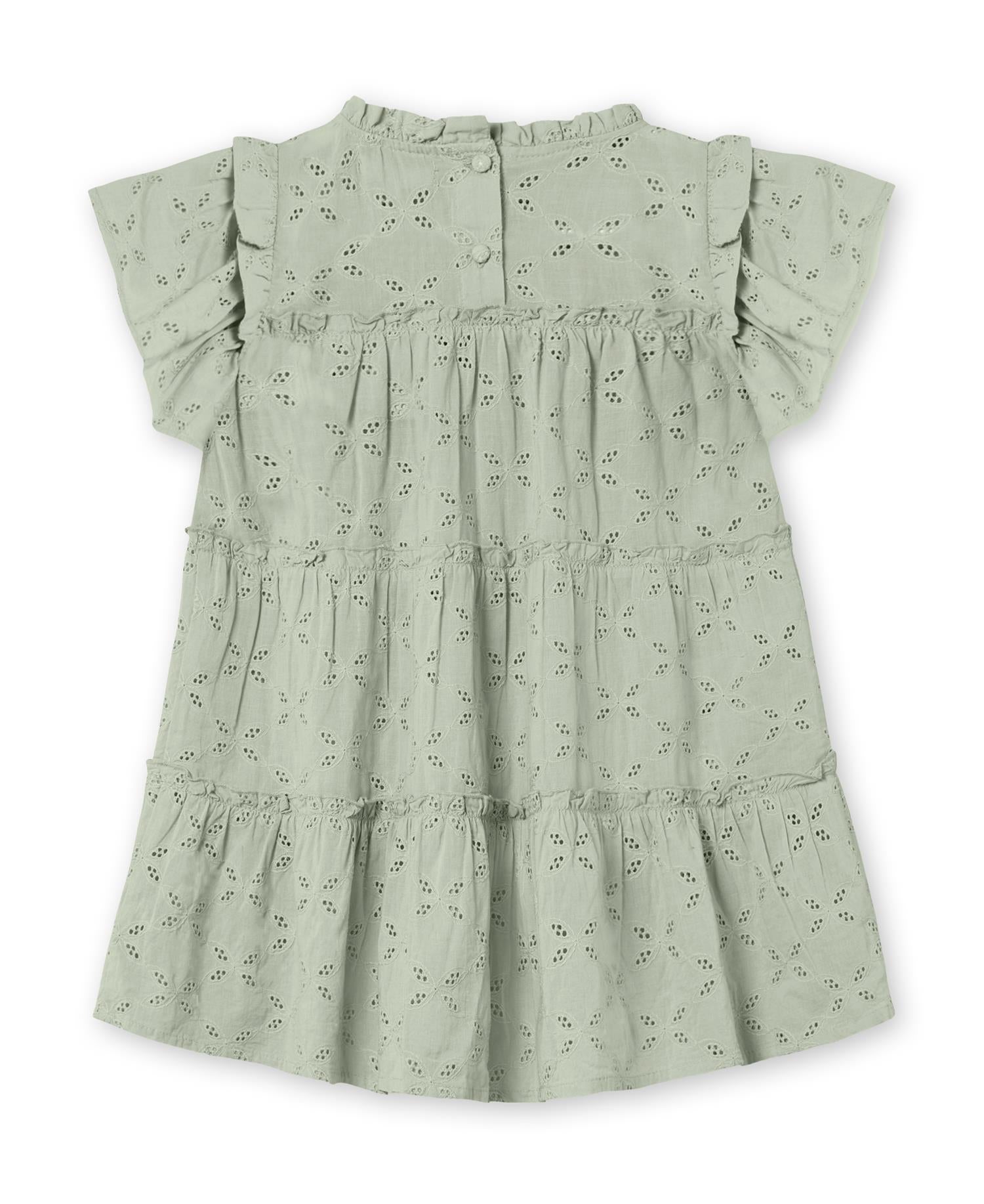 kjolei myk, vevd broderie anglaise med feminine rysjer på skuldrene, i halsen og med rynkede kanter. Kjolen har to stoffkledde knapper bak, som gjør den enkel å ta av og på.