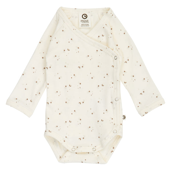 Nydelig, myk ribbet body med krysslukking. Vakkert heldekkende stjernetrykk. Bodyen kan åpnes helt opp foran med trykknapper, slik at den ikke trenger å gå over babyens hode. Bodyen har også trykknapper nederst.