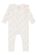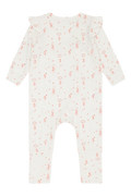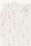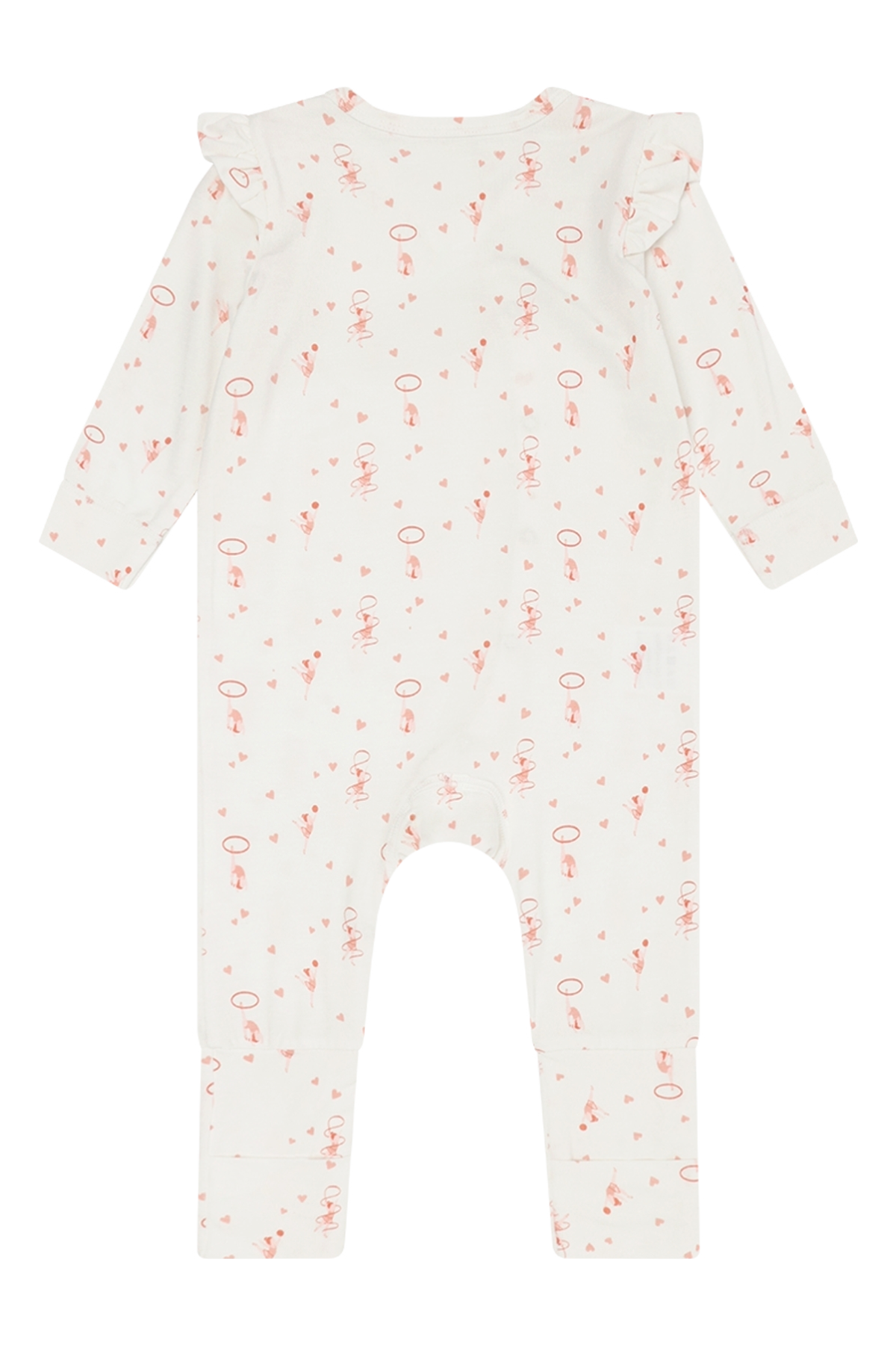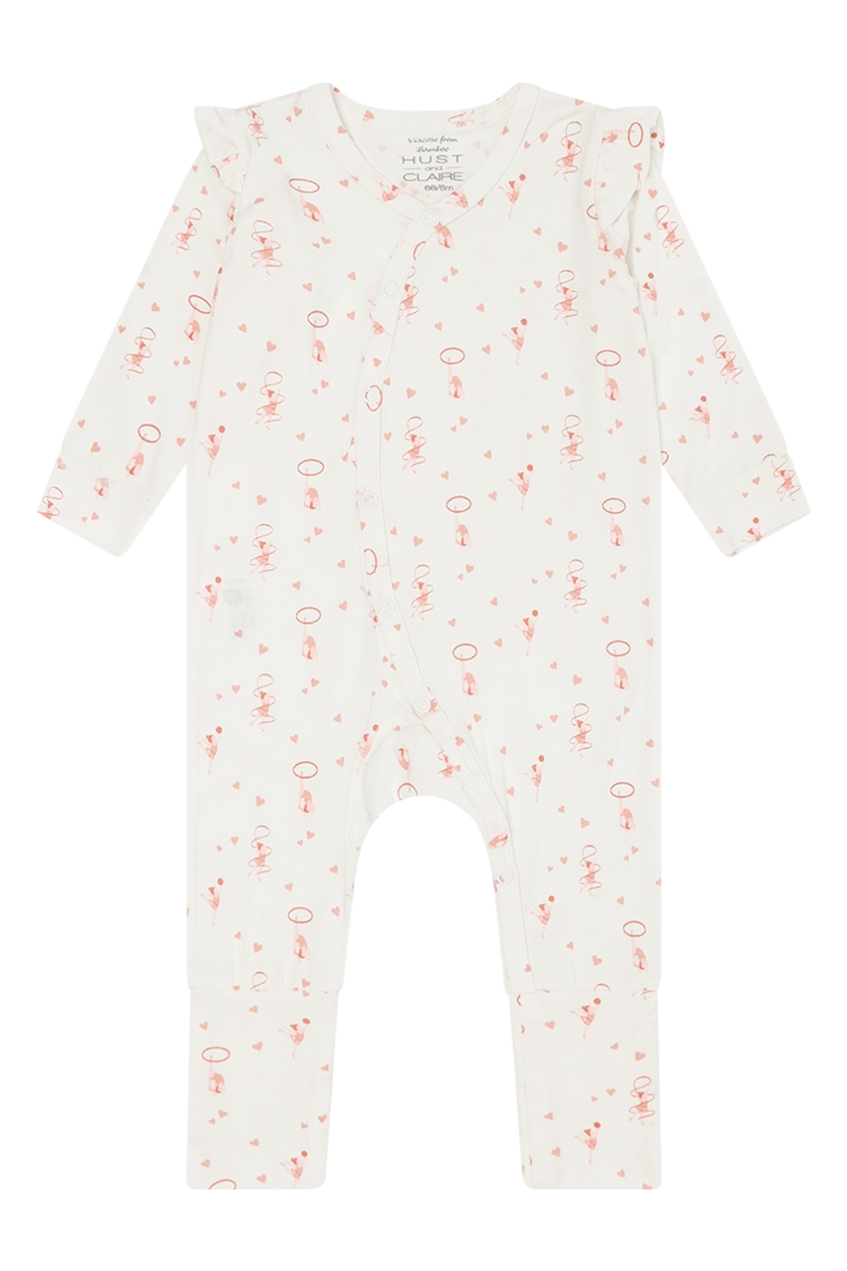 Heldress i myk, elastisk viskose fra bambus med trykk. Dressen har trykknapper asymmetrisk fra halsen og ned til venstre fot. Ved føttene er det påsatt en foldefot som man kan få foten gjennom, men som også kan foldes og brukes som en sokk.
