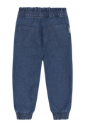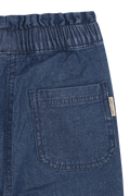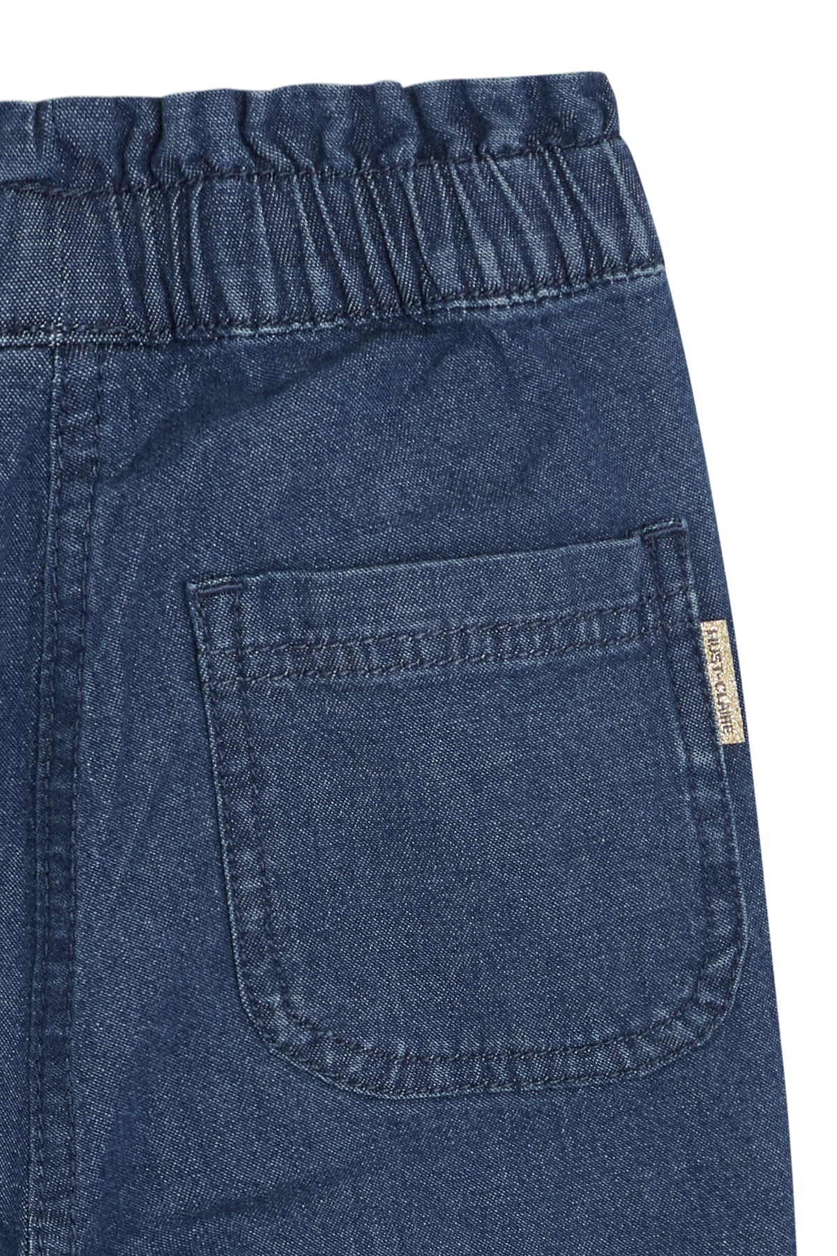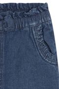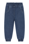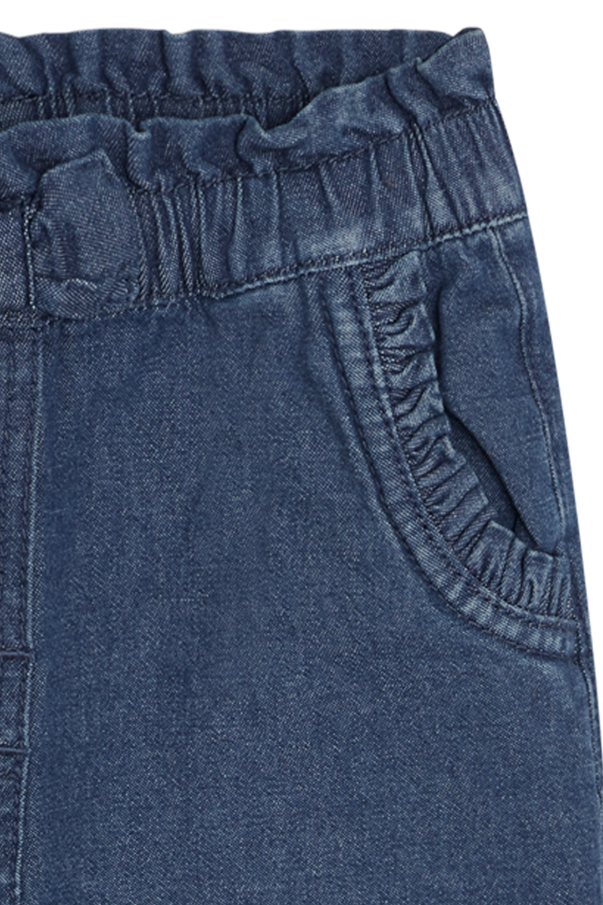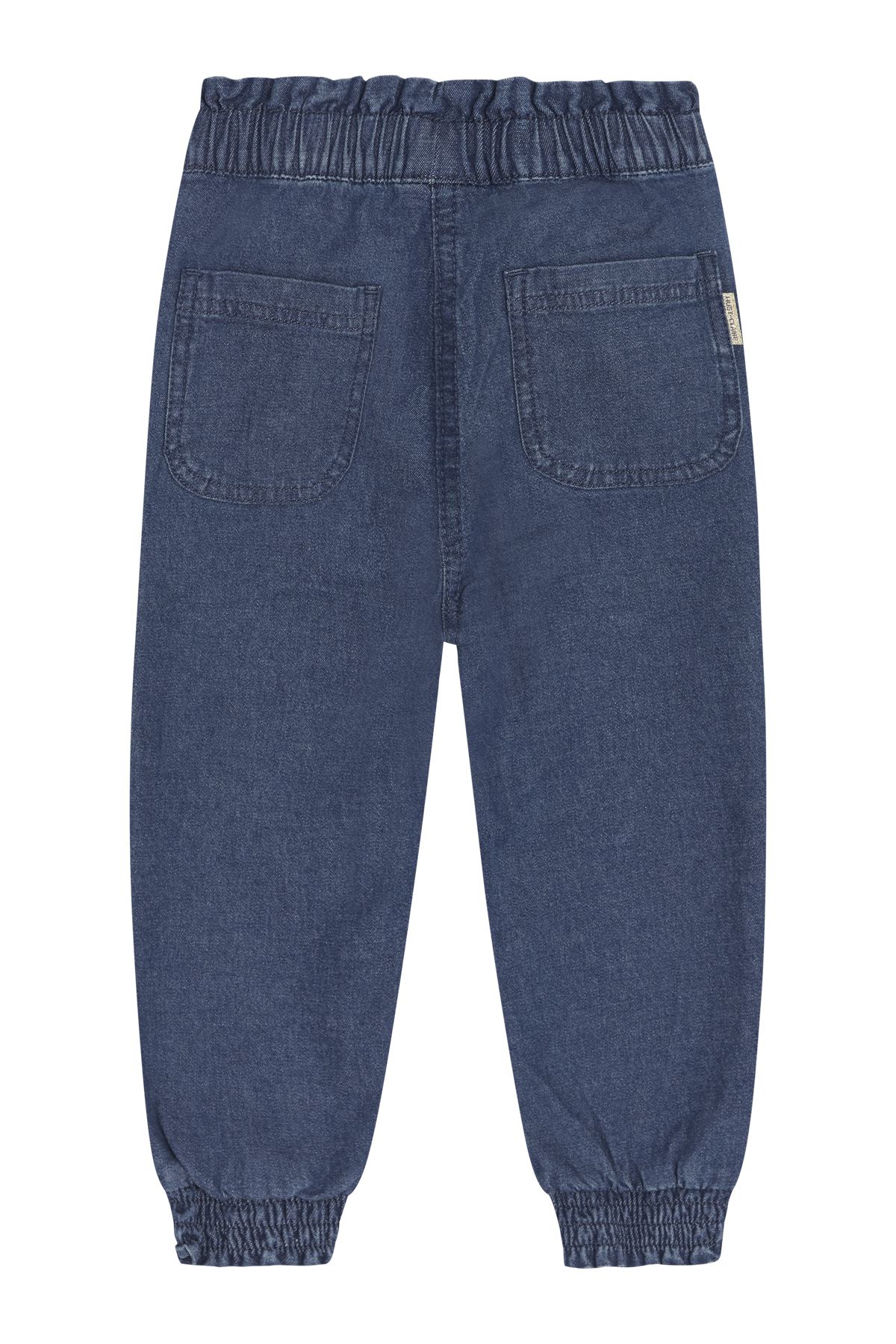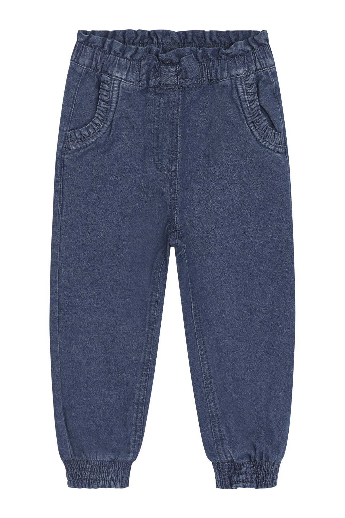 Bukser i denimlook med elastikk i midjen og dekorativ sløyfe foran. Modellen har lommer foran og bak, og lommene foran er dekorert med volanger. Med justerbar midje.