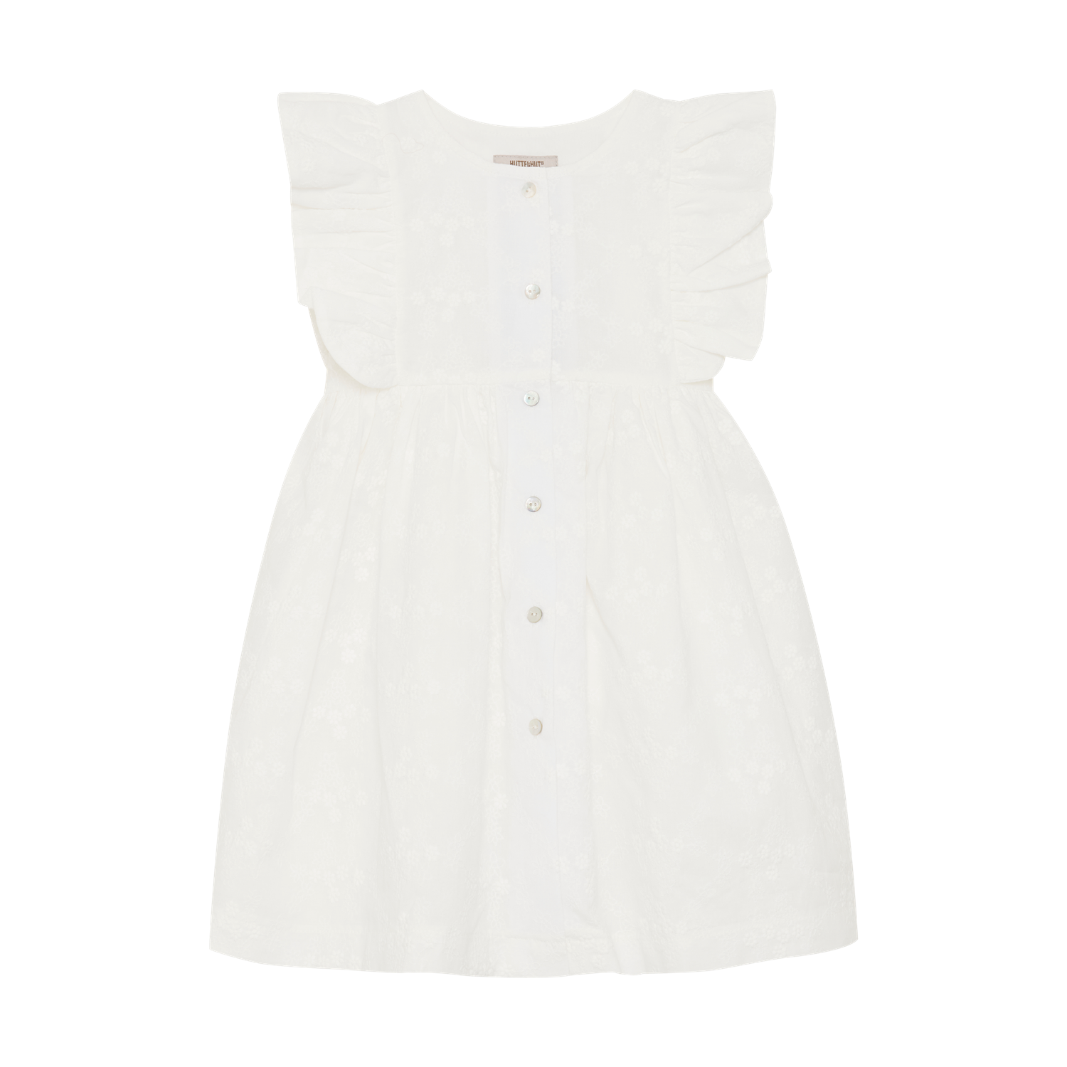 Nydelig sommerkjole fra HUTTEliHUT. Den har mange søte detaljer og knapper foran, og fôr slik at den ikke er gjennomsiktig. Det er broderi over hele kjolen og rysjer rundt ermeåpningen.