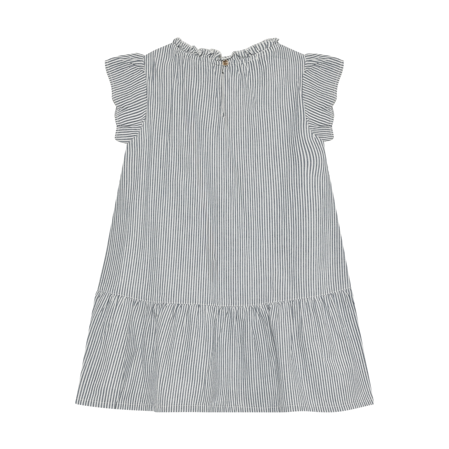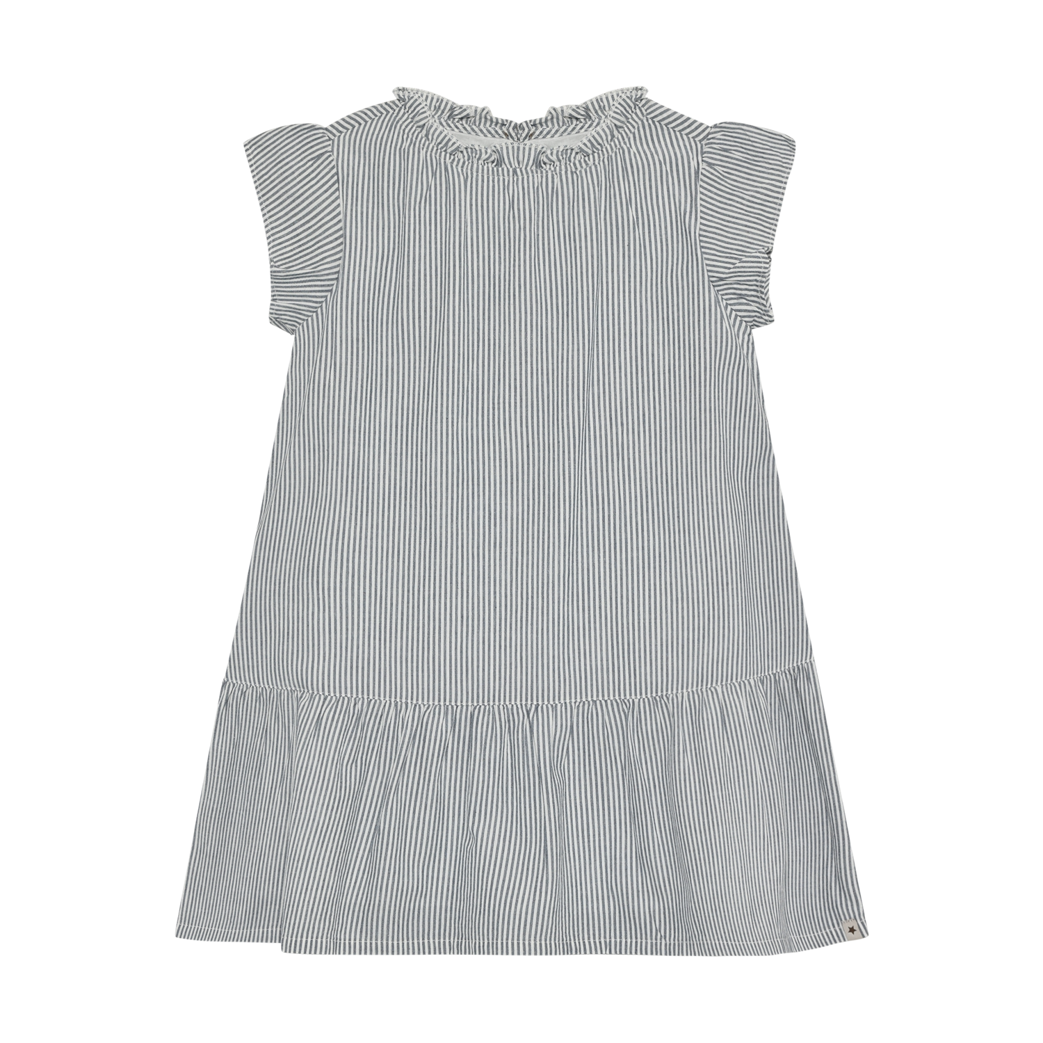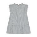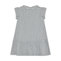 Stripete sommerkjole fra HUTTEliHUT. Den er laget av myk bomull med et tynt fôr. Den har et lite erme og en ekstra volang nederst, noe som gir fylde. Den lukkes bak med en enkelt knapp.