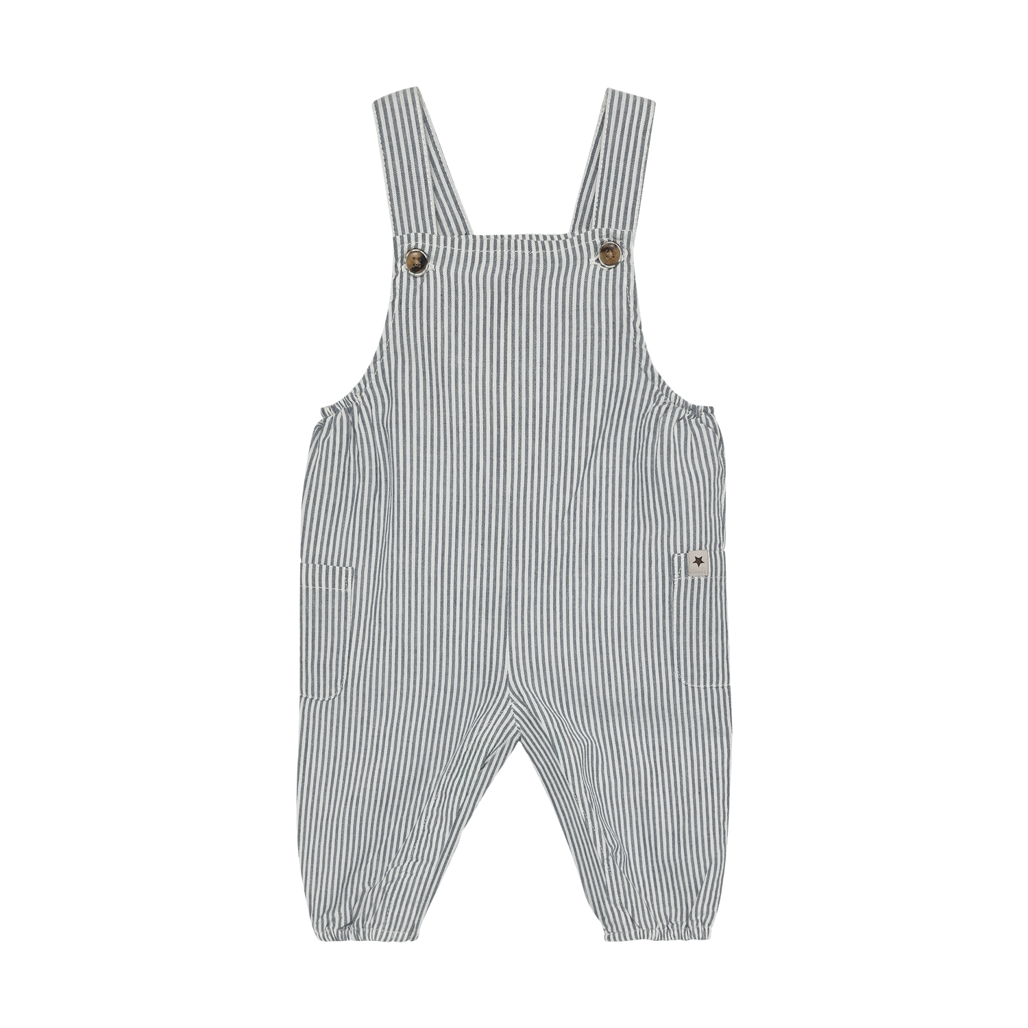 Stripete selebukse fra HUTTEliHUT. Selebuksen har justerbare seler og små lommer på sidene. Buksen har lange ben med elastiske kanter. Det er trykknapper nederst, slik at den er enkel å ta av og på.