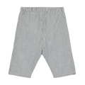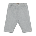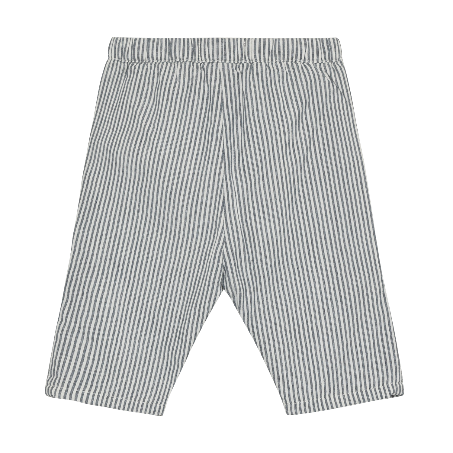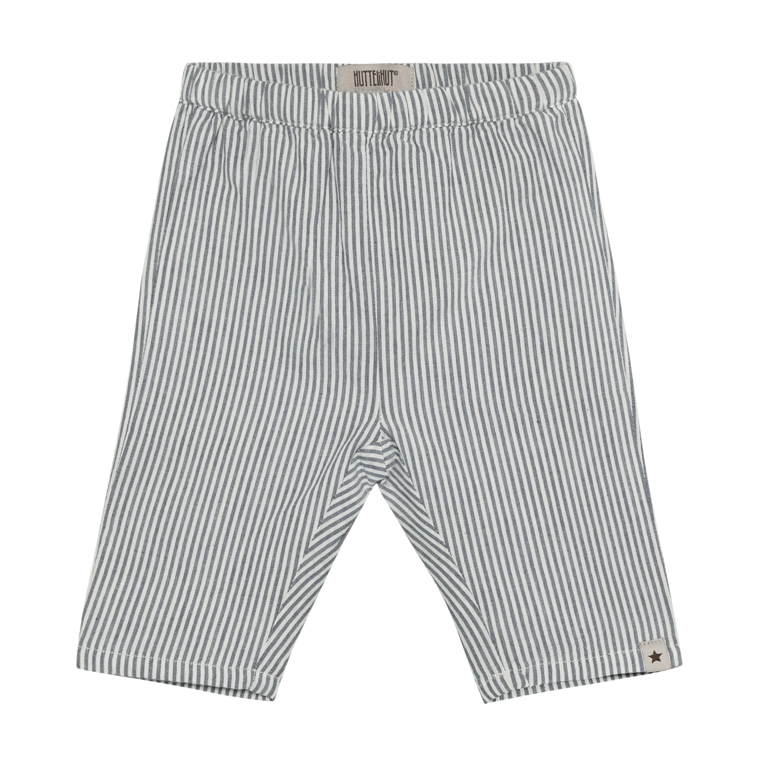 Enkle HUTTEliHUT-bukser med vertikale striper. Buksene har rette ben, strikk i midjen og er laget av myk bomull med et tynt fôr.