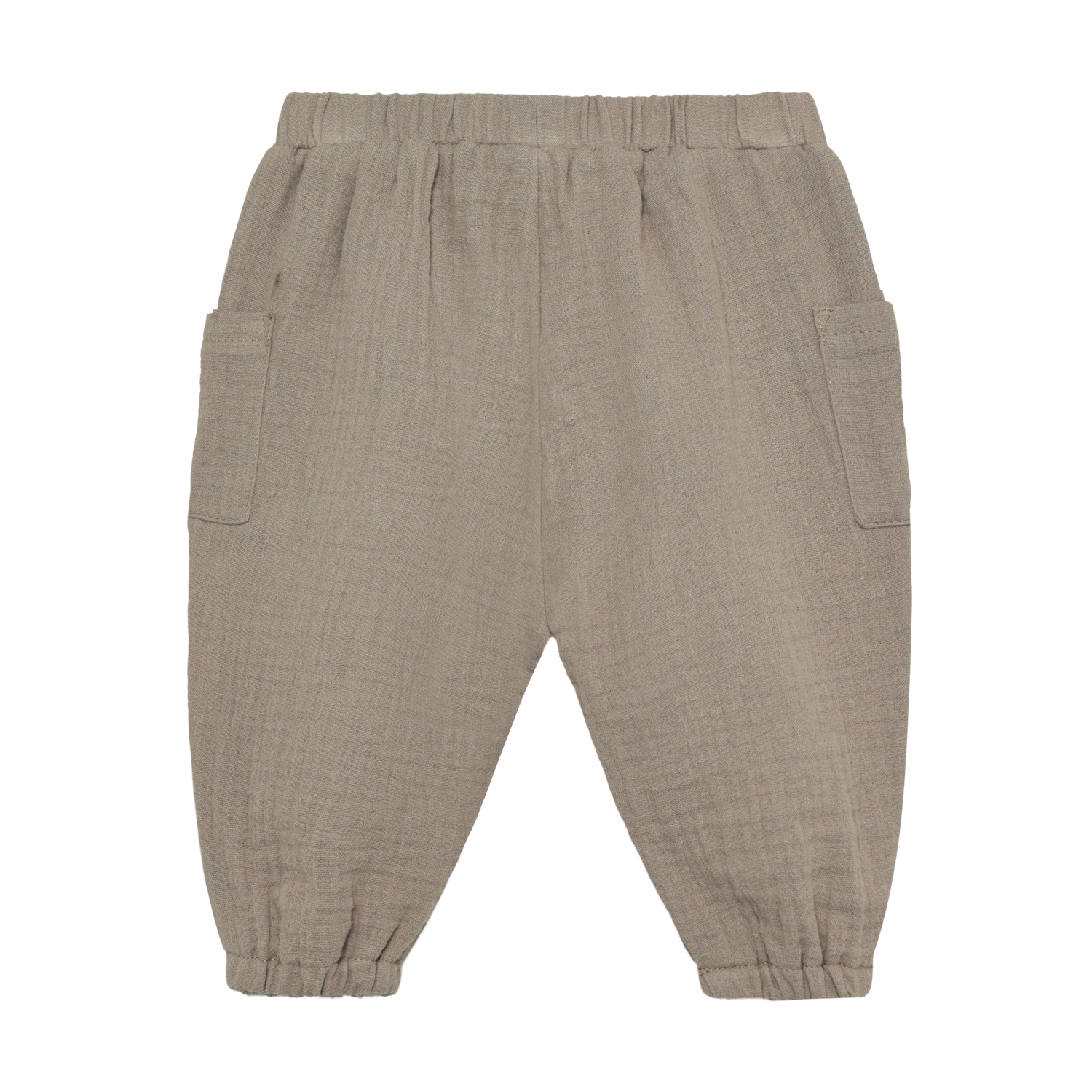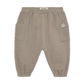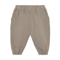 Enkle HUTTEliHUT-bukser i muslinstoff. Buksene har strikk i midjen og strikk i åpningen av buksebena. Det er små lommer på sidene.
