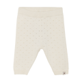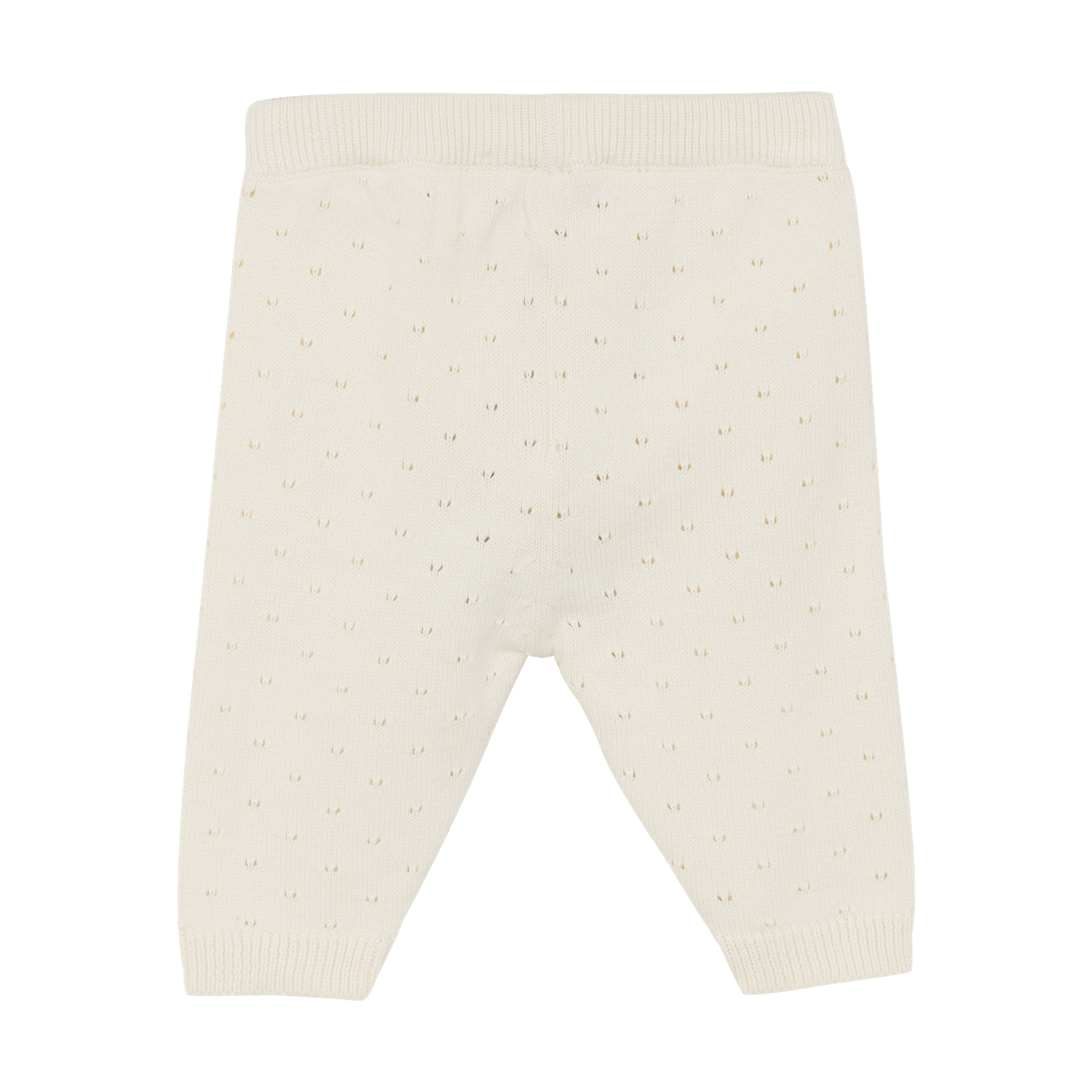Strikkebukser med pointellemønster fra HUTTEliHUT. Bred elastisk linning og ribbekanter ved åpningen av bena.